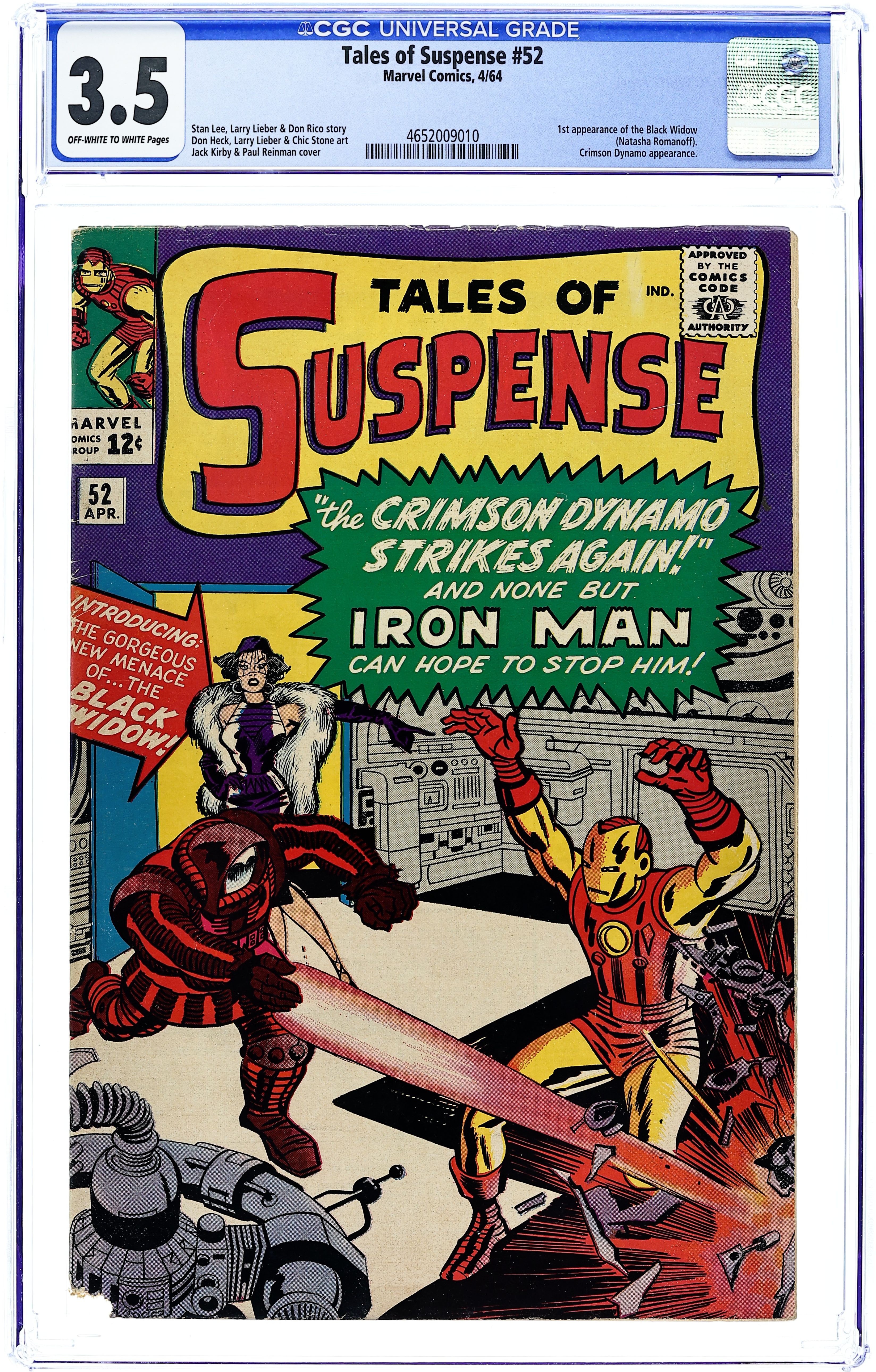 Cover pencils by Jack Kirby, inks by Paul Reinman. First appearance of the Black Widow in "The Crimson Dynamo Strikes Again!", script by Stan Lee (plot) and Don Rico (as N. Korok), art by Don Heck; The Black Widow and Boris are sent to America to kill Anton Vanko, the Crimson Dynamo, for defecting to America; They are also tasked with killing both Iron Man and Tony Stark. The first half of "The Magician" text story. "The Seance!", script by Stan Lee (plot) and Larry Lieber, pencils by Larry Lieber, inks by Chic Stone; A fake medium uses special effects to simulate supernatural powers, but he is taken into the spirit world by real ghosts as punishment. "The Failure!", script by Stan Lee (plot) and Larry Lieber (script), pencils by Larry Lieber, inks by Paul Reinman; The Earth of the future is overwhelmingly materialistic, except for one idealistic young man and his lover; They are abducted by aliens, who have determined that he is the best suited to be absolute ruler of their empire. This issue includes a statement of ownership - average print run, 318,932; average paid circulation, 188,005. 36 pages, full color. Cover price $0.12. Grade: CGC 3.5 explanation of grade Condition: Used (collectible)