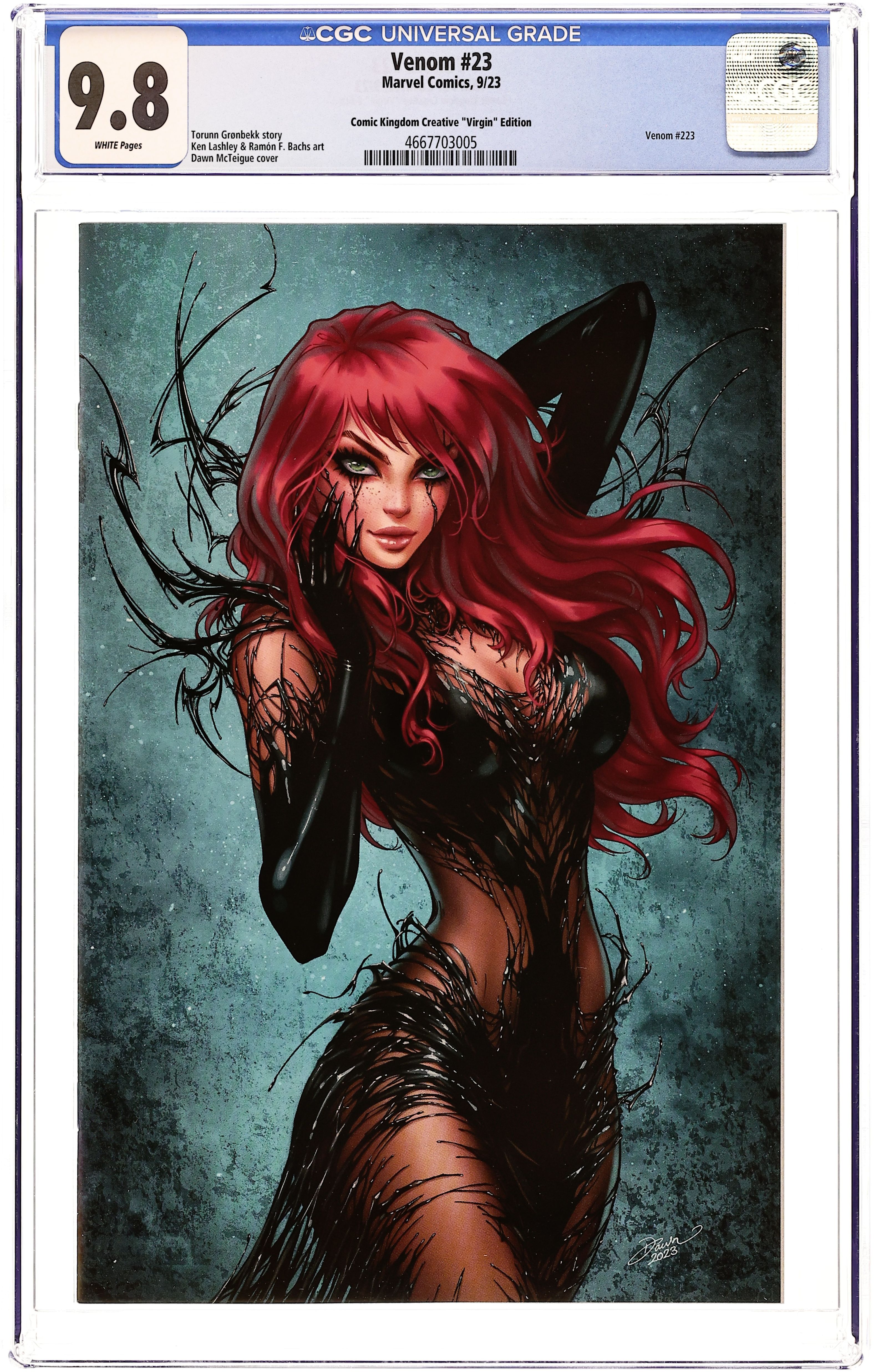 Comic Kingdom Creative Exclusive Virgin Cover by Dawn McTeigue. Written by Torunn Gronbekk. Art by Ken Lashley. A NEW VISION OF TOXIN! Toxin is the offspring of the most dangerous symbiote in the history of the Marvel Universe: CARNAGE. But while Carnage and Cletus Kasady are separated and both devising machinations and plans of cosmic bloodshed and conquest, what has its progeny been doing? And will Dylan Brock or the Venom symbiote survive when they come face to face with this latest terrifying Toxin?! PLUS: Toxin isn't the only symbiote in this story who's unlike anything you've ever seen! The symbiote family is about to grow a little larger… and what's coming will change the continuing saga of the symbiotes FOREVER! 28 pages, full color. Rated T+ Grade: CGC 9.8 explanation of grade Condition: Used (collectible)