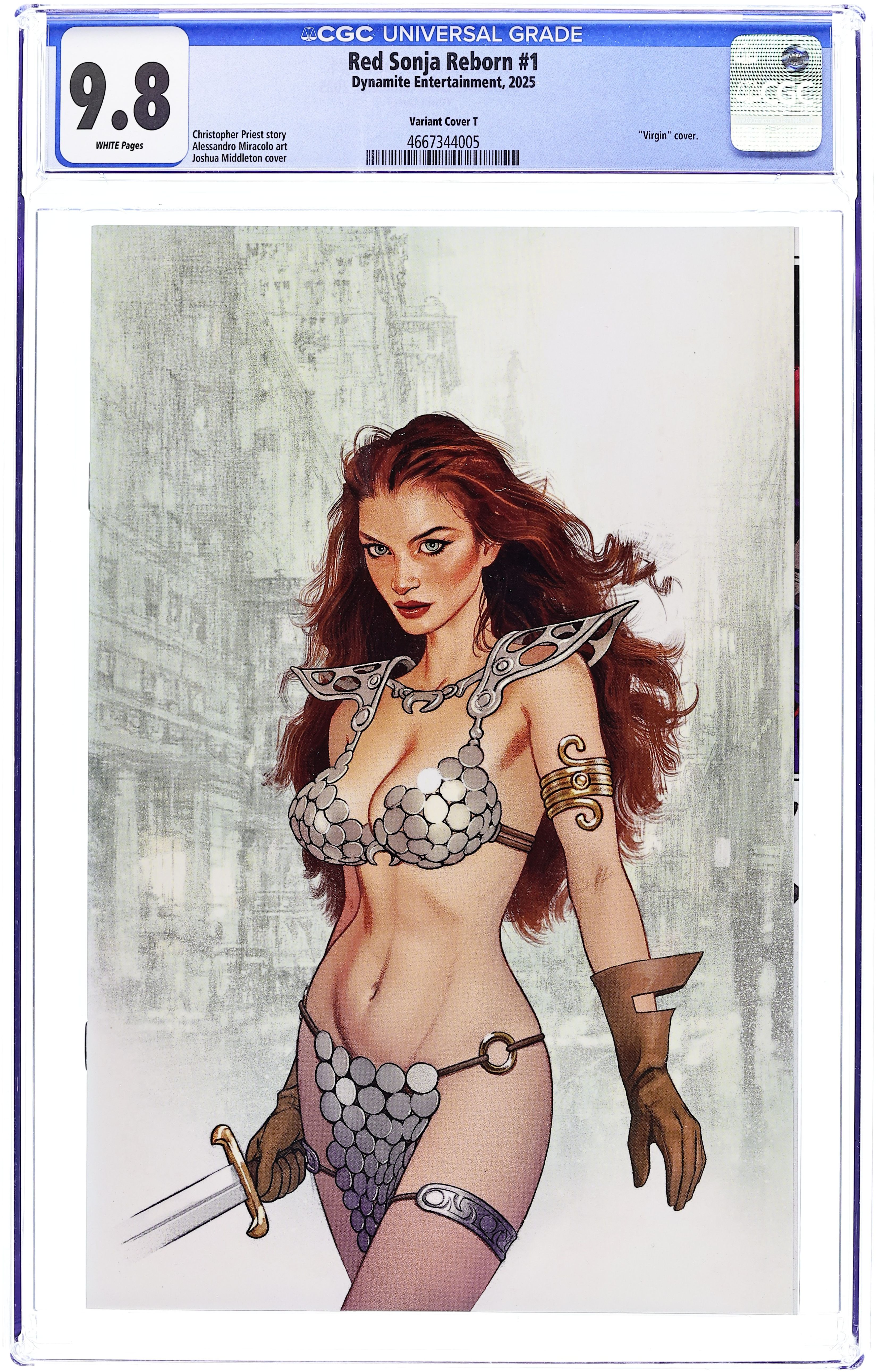 Limited 1 for 25 Retailer Incentive Variant Cover. Written by Christopher Priest. Art by Alessandro Miracolo. Cover by Joshua Middleton. BAPTISM OF FIRE! In a contest to decide the fate of the world, the ancient (and codependent) gods The Light and The Dark transport Maggie Sutherland, a young British clerk, from the year 2025 into the wilds of Hyboria, where she awakens transformed into the renowned Hyrkanian Bellatrix Red Sonja. Thrown headlong into a realm of gods and monsters, Maggie must quickly learn how to survive both the harsh environment and the constant threats posed by friends and foes alike as she struggles to find her way home. Legendary comics writer CHRISTOPHER PRIEST (Vampirella, Black Panther, Conan) and artist ALESSANDRO MIRACOLO rebuild the crimson-maned warrior from the inside out in Sonja Reborn - a riveting reinterpretation of her hero's journey that reveals what it might actually take for a single woman to survive in a brutal world of sorcery and barbarism! 32 pages, full color. Rated T Cover price $4.99. Grade: CGC 9.8 explanation of grade Condition: Used (collectible) unless item is a new release