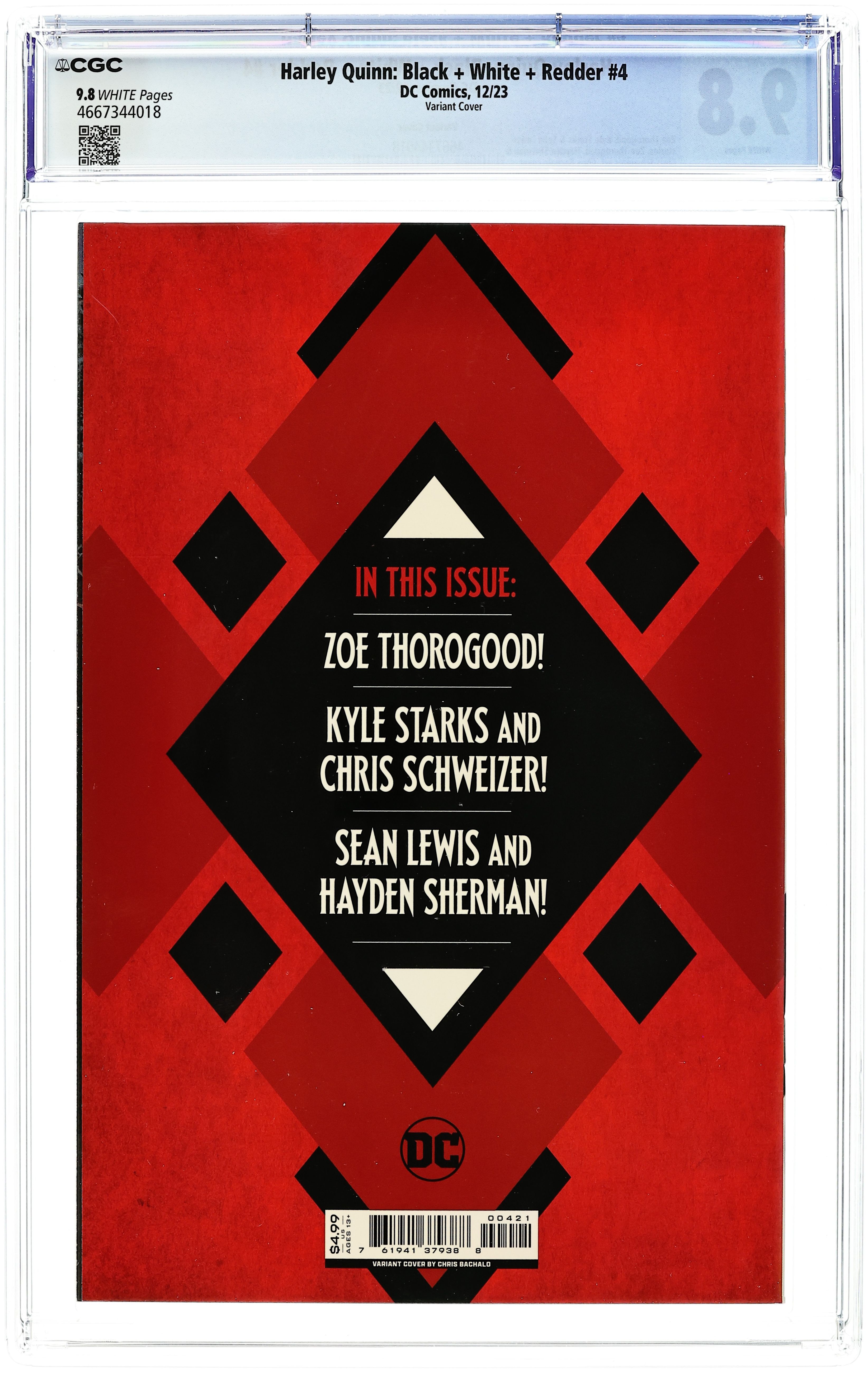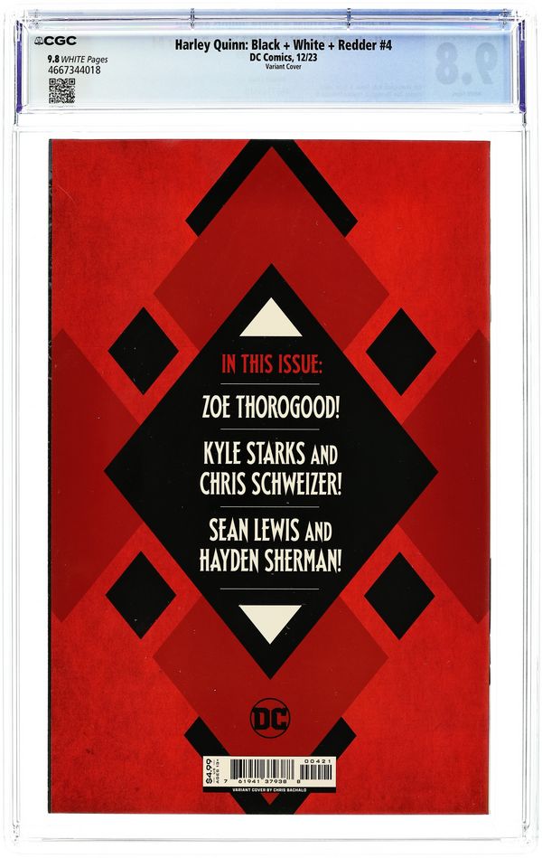 Written by Zoe Thorogood, Sean Lewis, Kyle Starks. Art by Zoe Thorogood, Hayden Sherman, Chris Schweizer. Cover by Chris Bachalo. Eisner nominee Zoe Thorogood has Harley recruit seven girls who compete to be her sidekick, but their attempts to be like Harley give her a bit of an identity crisis! Kyle Starks (Peacemaker Tries Hard!) and Chris Schweizer reacquaint Harley with an old college friend who needs her help to get back at their mutual bully! And Sean Lewis (King Spawn) and Hayden Sherman (DC Pride 2023) take Harley into the future, where an alien invasion might destroy the Earth, but more importantly, interrupt her favorite show! 40 pages, CP/B&W. Rated T+ Cover price $4.99. Grade: CGC 9.8 explanation of grade Condition: Used (collectible)