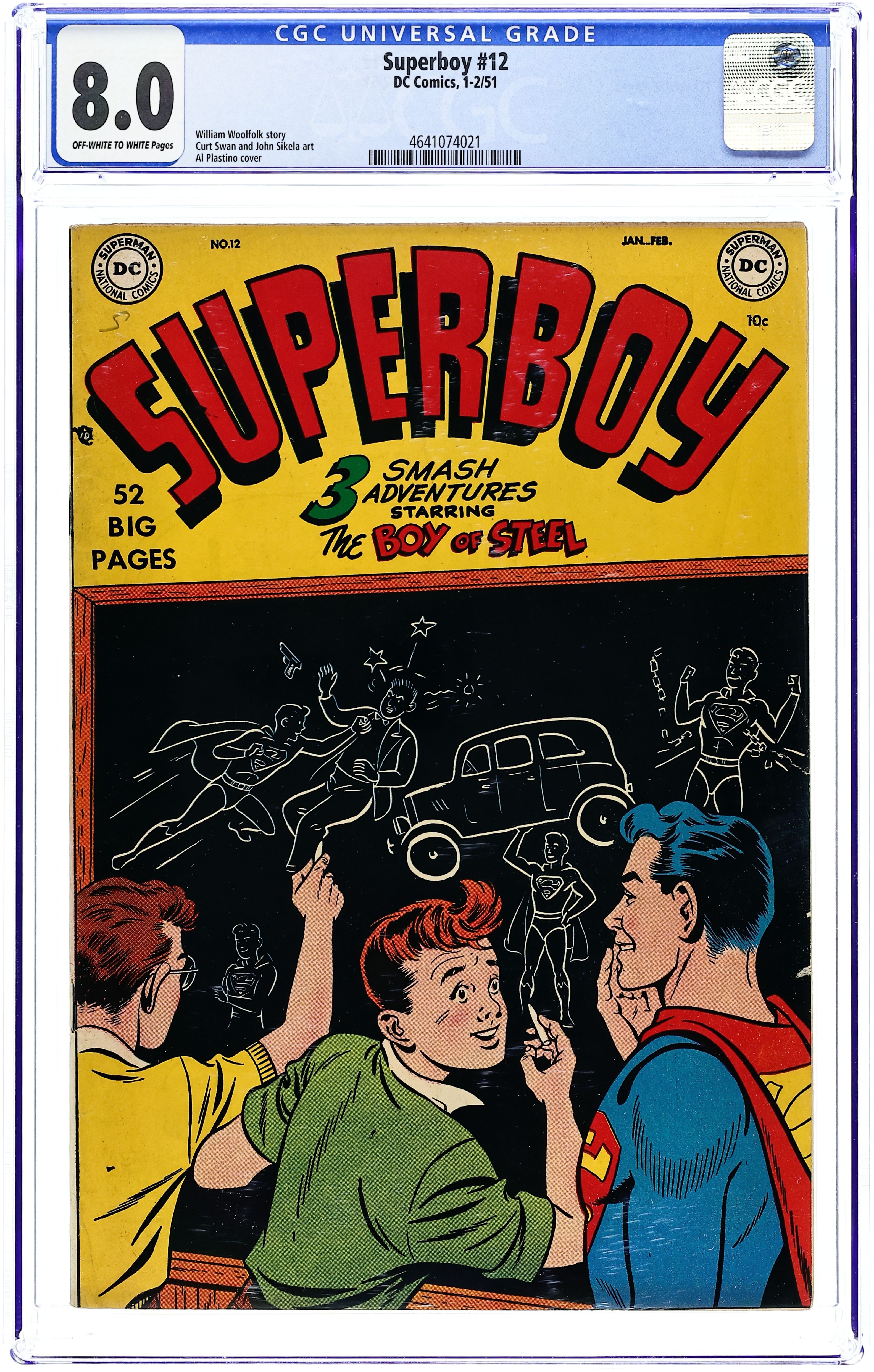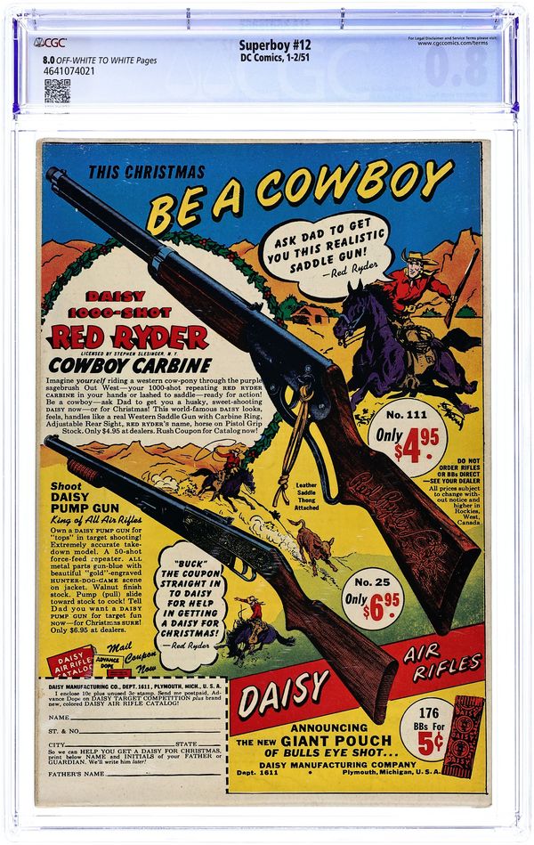 Cover art by Al Plastino. The Heroes' Club! starring Superboy, pencils by Curt Swan, inks by John Fischetti; A high school student tries to clear his ancestor's name. The Puppet That Came to Life!, pencils by John Sikela, inks by Ed Dobrotka; A famous tv puppet seems to come to life on its own. Peg humor page by Henry Boltinoff. Sid Caesar biography. How to Bring Christmas Cheer public service announcement starring Superboy, script by Jack Schiff, pencils by Win Mortimer, inks by Creig Flessel. Superboy's Problem Parents!, script by William Woolfolk, pencils by John Sikela, inks by Ed Dobrotka; Ma and Pa Kent switch jobs to see which has the harder work to do. Build a Rotoship!--Superboy's Workshop activity page. 52 Pages, Full Color. Cover price $0.10. Grade: CGC 8.0 explanation of grade Condition: Used (collectible)
