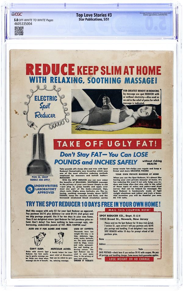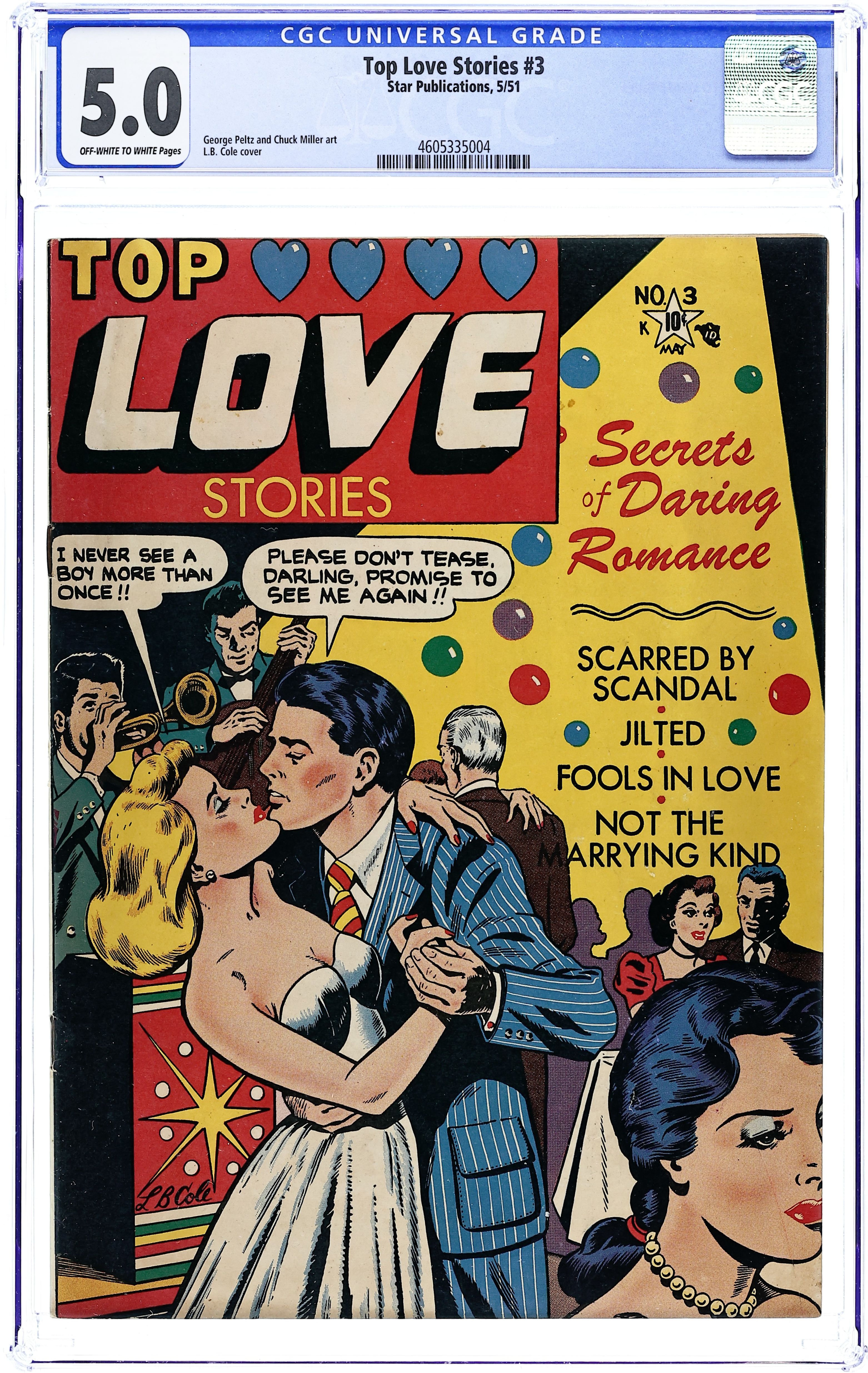L.B. Cole cover. Numbering continues from Gasoline Alley (1950 Star) #2. Contains original and reprinted material as noted. In order of appearance: "Fools in Love!!" art by George Peltz; "Not the Marrying Kind!" retitled and reprinted from "I Loved to Hate" in I Loved (1949) #28; and "Jilted!!" retitled and reprinted from "Danger Called Me" in Women in Love (1949-50 Fox) #1. "Scarred by Scandal" text story retitled and reprinted from "My Fearful Night" in My Past (1949 Confessions) #7 and as "Love Must Be Faithful.." in Popular Teen-Agers (1950) #15. 36 pages. Full color. Cover price $0.10. Grade: CGC 5.0 explanation of grade Condition: Used (collectible)