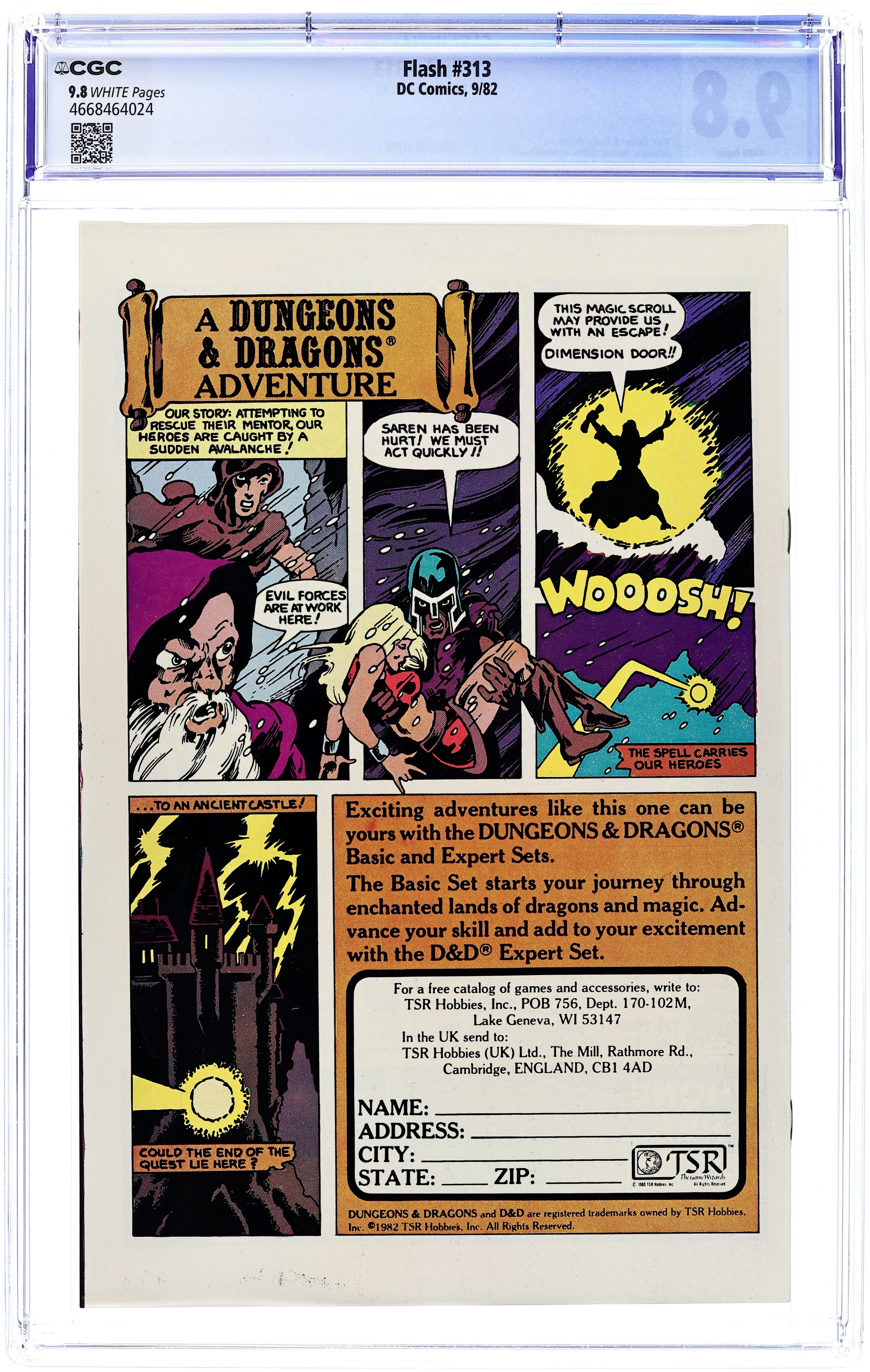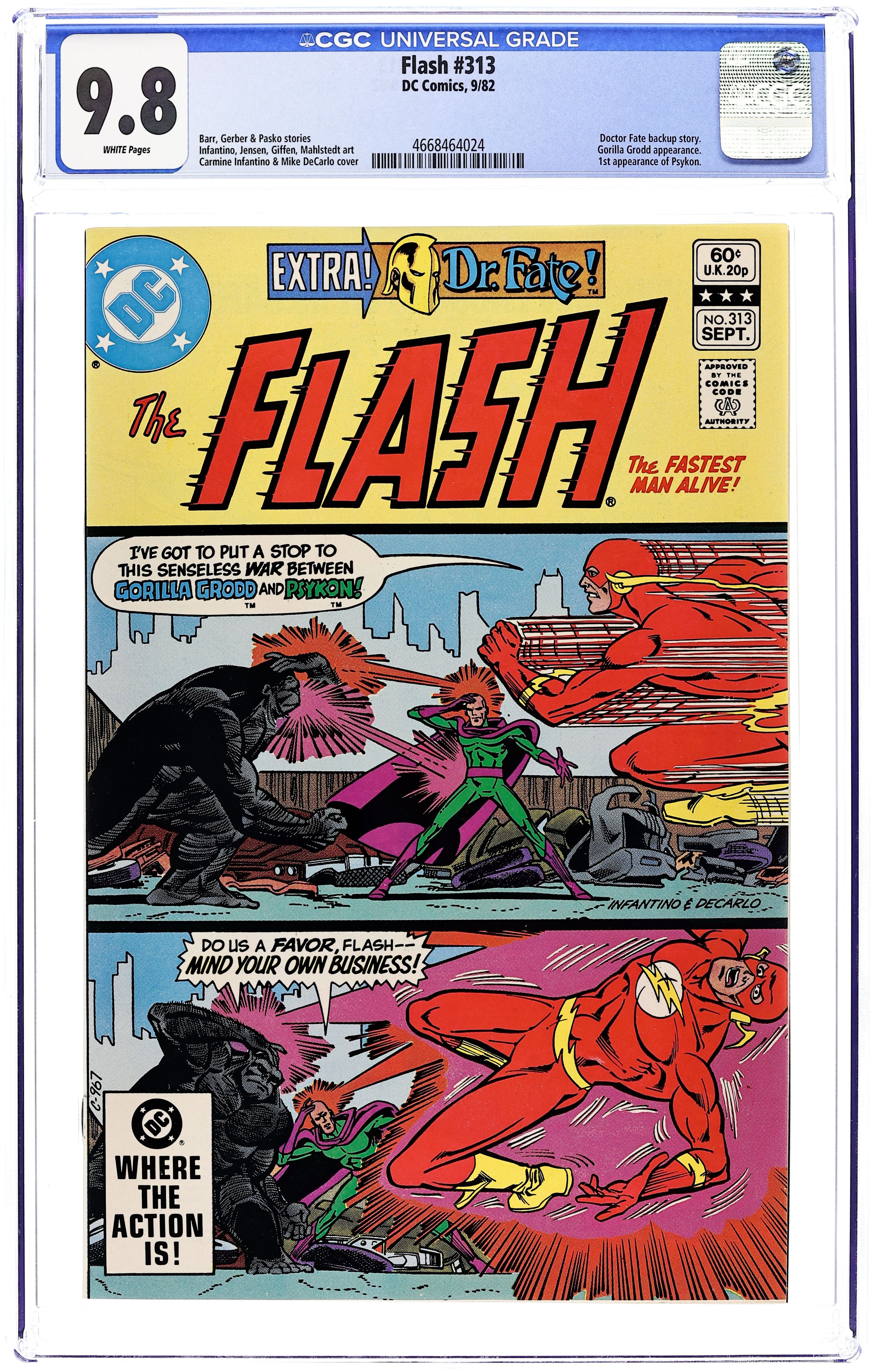 Starts Feb 9 Direct Edition. Cover pencils by Carmine Infantino, inks by Mike DeCarlo. 3-Way Fight For a Super-Simian, script by Mike W. Barr, pencils by Carmine Infantino, inks by Dennis Jensen; A mysterious spiritual being named Psykon takes possession of a homeless man and takes on Flash and Gorilla Grodd. Crimson Testament, script by Steve Gerber and Martin Pasko, pencils by Keith Giffen, inks by Larry Mahlstedt; Dr. Fate must face renegade lord of order Ynar, who uses a crimson gem to transform the landscape and people into hideous forms. SGT Rock toy ad from Remco, art by Joe Kubert. Dungeons and Dragons Basic and Expert Sets ad. 36 Pages, Full Color. Cover price $0.60. Grade: CGC 9.8 explanation of grade Condition: Used (collectible)