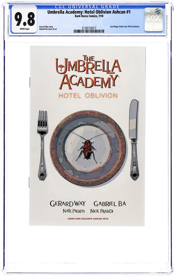 Starts Jan 19 Story by Gerard Way. Art by Gabriel Ba. Comic Con Exclusive Ashcan-sized preview of Umbrella Academy Hotel Oblivion (2018) #1. 5 1/2" x 8 1/2". 16 pages. Full Color. Grade: CGC 9.8 explanation of grade Condition: Used (collectible)