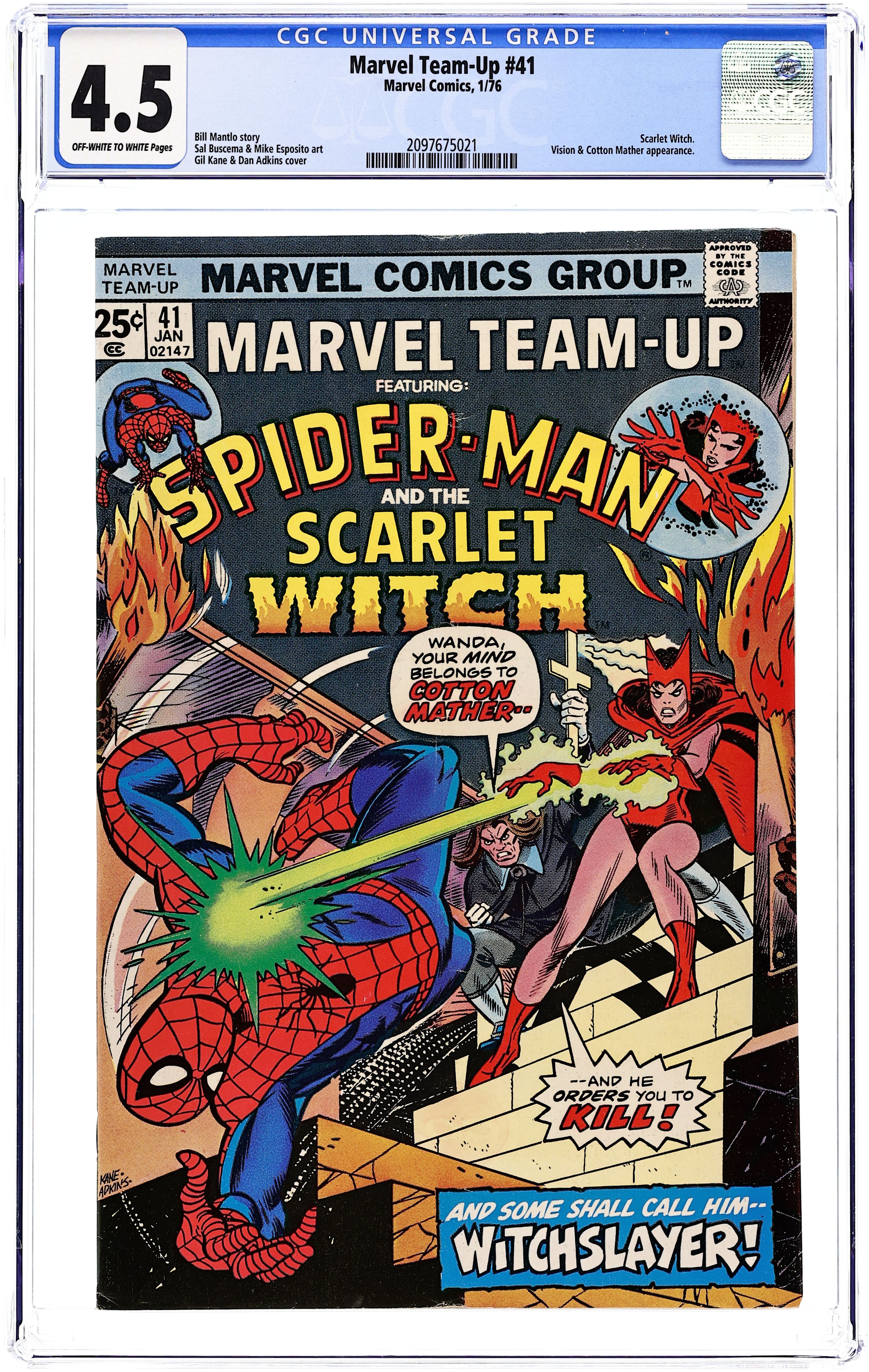 "A Witch in Time!" Part 1 of 4. Guest-starring Spider-Man and the Scarlet Witch. Script by Bill Mantlo. Pencils by Sal Buscema. Inks by Mike Esposito and Dave Hunt. Cover by Gil Kane and Dan Adkins. The Scarlet Witch is going back in time! To the one place any witch would never want to go...1692 Salem, Massachusetts! What has possessed Wanda to travel to an abandoned castle in Latveria and rendezvous with Doctor Doom's time machine and a deranged 17th century preacher? The Scarlet Witch knows she's in trouble against Cotton Mather and sends a desperate plea for help back to New York. Who will answer her plea? The Amazing Spider-Man! Can the web-slinger save Wanda from a horrible fate...or will the Salem Witch Trials claim another victim? Cameo appearance by the Vision. (Note: The letters page contains Marvel Value Stamp Series B #14 Spider-Man.) 36 pages. Cover price $0.25. Grade: CGC 4.5 explanation of grade Condition: Used (collectible)