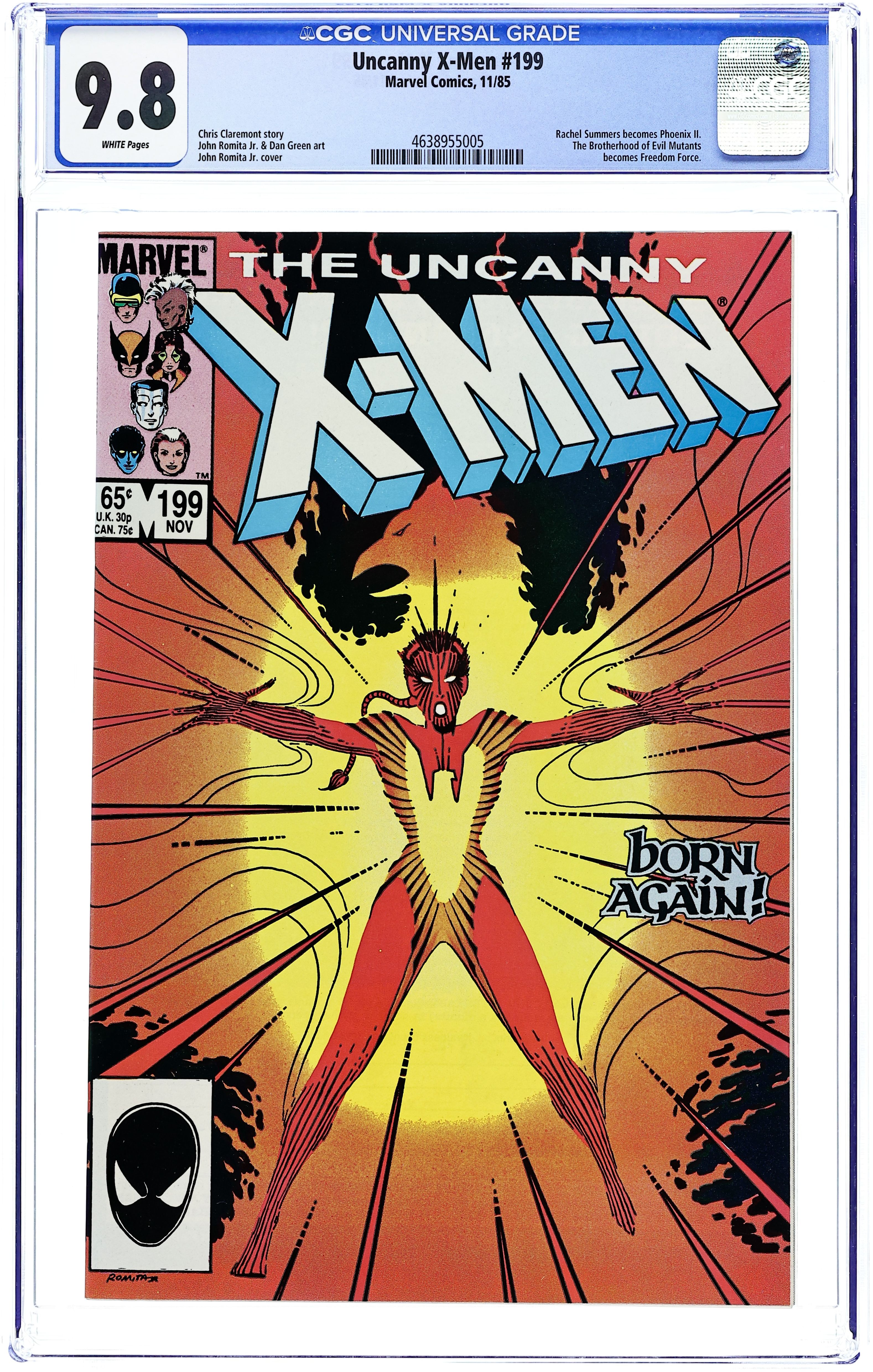 Starts Feb 2 Direct Edition. Story by Chris Claremont. Art by John Romita, Jr. and Dan Green. "The Spiral Path!" Rachel Summers embraces the legacy of the Phoenix. But is this a good thing, or bad thing? Plus, Mystique finally reveals herself to Valerie and makes the government liaisons an offer she can't refuse. NOTE: 1st appearance of Freedom Force. 36 pgs. Cover price $0.65. Grade: CGC 9.8 explanation of grade Condition: Used (collectible)