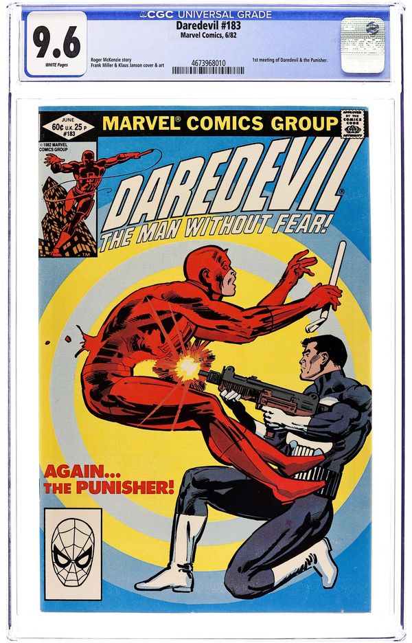 Direct Edition. Cover pencils by Frank Miller, inks by Klaus Janson. Child's Play, script by Roger McKenzie and Frank Miller, pencils by Frank Miller (breakdowns) and Klaus Janson (finished art), inks by Klaus Janson; A young girl on drugs takes a dive out of her school window and dies, and her brother, DD and the Punisher are all trying to track down the dealer responsible; Matt proposes to Heather; Hogman [Peter Grunter] is the guest villain. The last few pages are probably penciled by Janson from Miller breakdowns. This story was originally scheduled for issue 167 but delayed because the Comics Code did not approve it in its original form. 36 pgs. Cover price $0.60. Cover price $0.60. Grade: CGC 9.6 explanation of grade Condition: Used (collectible)