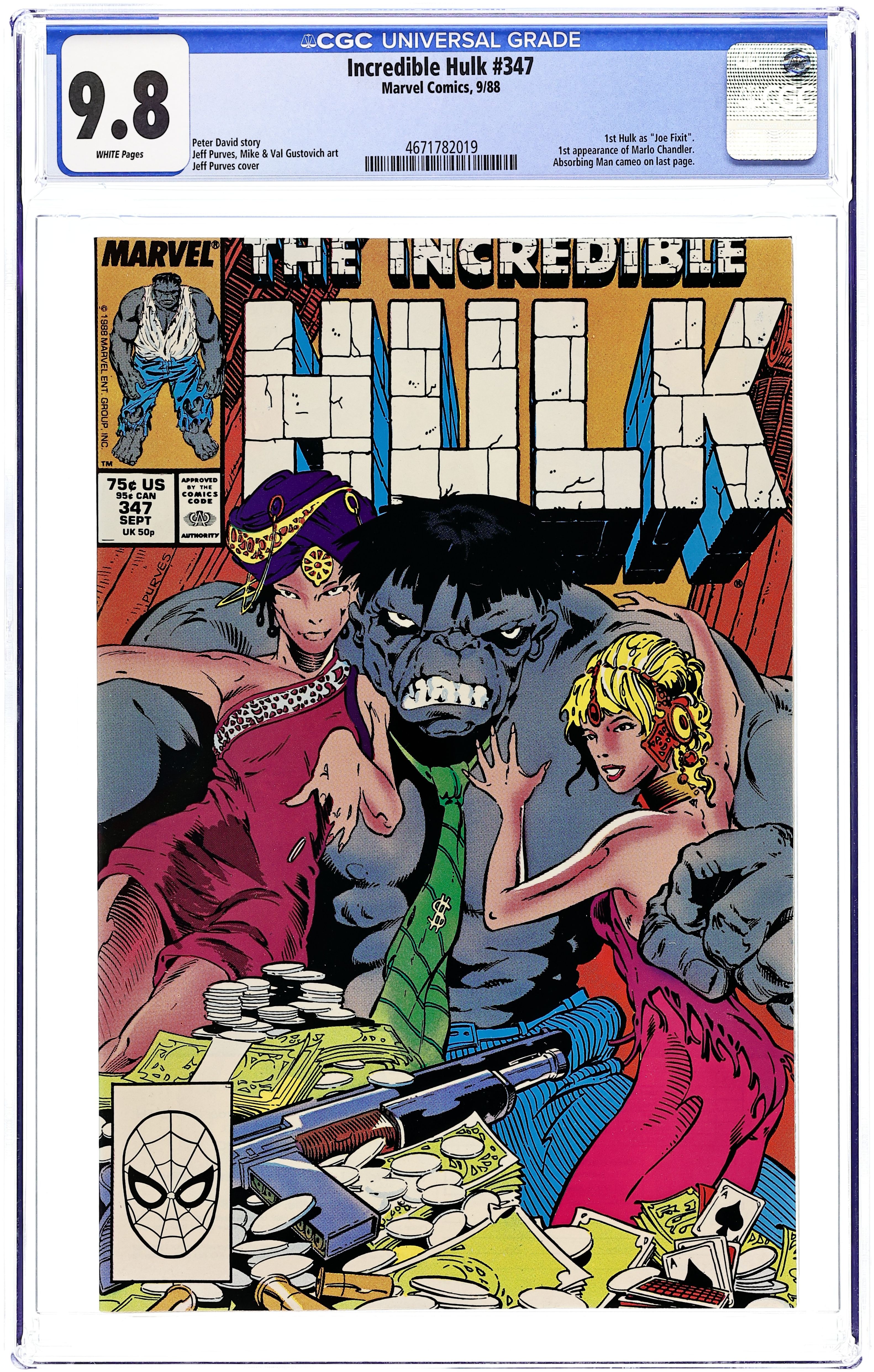 "Crap-Shoot!" 1st appearance of Marlo. Story by Peter David. Art by Jeff Purves, Mike and Valerie Gustovich. Three months later. Welcome to Las Vegas. Sin City. The land of lights where dreams are made and broken. Meet Mickey Berengetti, casino owner and all around mafioso. Whenever trouble rears its ugly head Mr. Berengetti simply calls in his new muscle to deal with it, Mr. Fixit. However, Fixit bears a striking resemblance to a certain Grey-Skinned Behemoth who's supposed to be dead. This is a great jumping on point for a new direction in the life of the Incredible Hulk. 36 pgs. Cover price $0.75. Grade: CGC 9.8 explanation of grade Condition: Used (collectible)