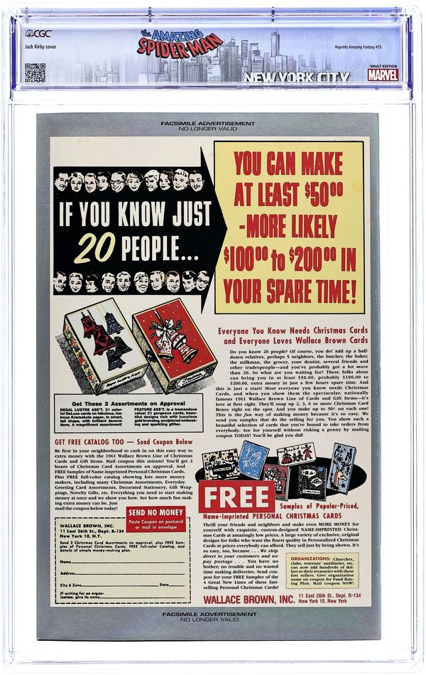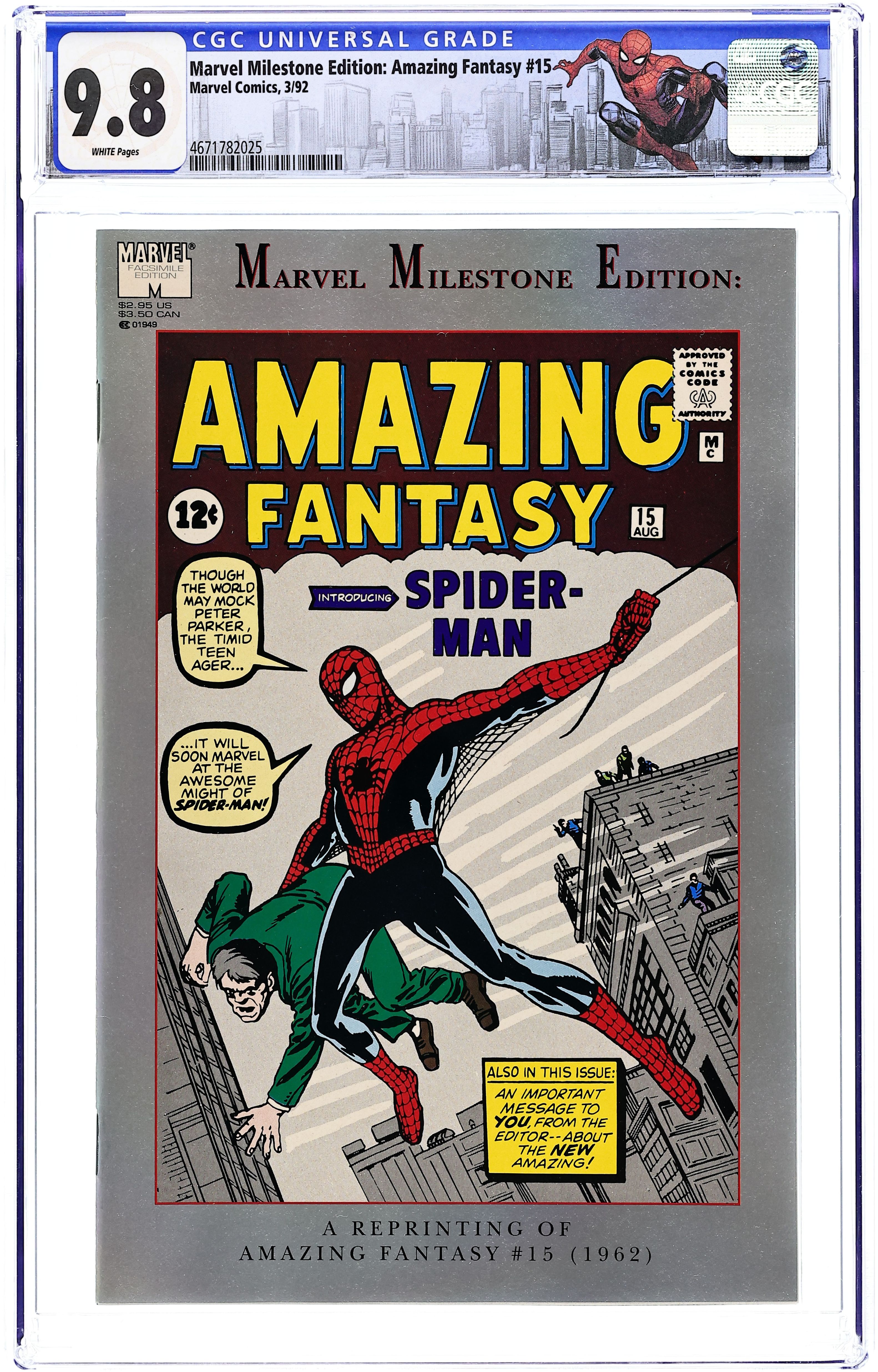 Reprints Amazing Fantasy 15 by Steve Ditko (1st Spider-Man) Cover price $2.95. Grade: CGC 9.8 explanation of grade Condition: Used (collectible)