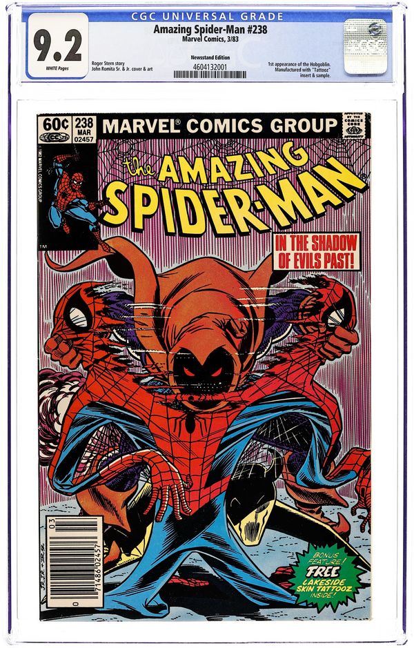 IMPORTANT: Issue 238B DOES NOT come with Lakeside Skin Tattooz (insert may be present, but tattoo is missing either way). Newsstand Edition. First appearance of the Hobgoblin in "Shadow of Evils Past!" Script by Roger Stern. Art by John Romita Jr. (breakdowns) and John Romita Sr. (finishes). Cover by John Romita Jr. and John Romita Sr. One of the landmark issues of the Amazing Spider-Man! And the beginning of the long secret identity mystery of the Hobgoblin! After escaping from the web-slinger, a bank robber stumbles upon an underground hideout of the (deceased) Green Goblin! Not knowing what to do with his discovery, the small-time hood shows the secret lair to an underworld associate! Unfortunately for the wondrous wall-crawler, the devious associate knows exactly what to do: resurrect the Green Goblin...with a twist! And a short time later a new super-villain is born! The Hobgoblin! Cameo appearance by Mary Jane Watson. Flashback cameo by Norman Osborn (aka the Green Goblin). (Notes: The secret identity of the original Hobgoblin takes many twists and turns over the next decade. Who actually operates as the Hobgoblin in this issue is revealed in the Spider-Man: Hobgoblin Lives (1997) Limited Series (written by Roger Stern). This issue was reprinted in Marvel Tales 257 and also in the 1992 trade paperback: the Amazing Spider-Man -- Origin of the Hobgoblin.) 36 pages. Cover price $0.60. Grade: CGC 9.2 explanation of grade Condition: Used (collectible)