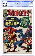 Cover pencils by Jack Kirby, inks by Chic Stone. First appearance of Immortus in "The Avengers Break Up!", script by Stan Lee, pencils by Don Heck, inks by Dick Ayers; Immortus appears before the Masters of Evil and demands to join them against the Avengers, using his control of the realm of Limbo to summon other powerful people from past ages to help them. Roster: Captain America, Thor, Iron Man, Wasp, Giant-Man, and Rick Jones. Villains: the Executioner, the Enchantress, Baron Zemo, and Kang. Letter to the editor from comics artist Gene Day. 36 pgs., full color. $0.12. Cover price $0.12. Grade: CGC 7.0 explanation of grade Condition: Used (collectible)