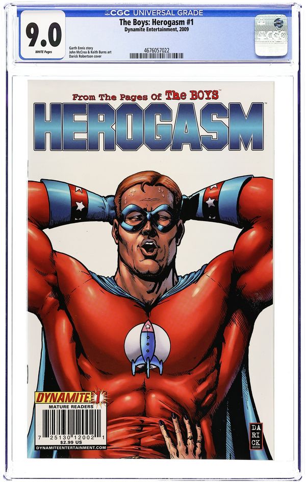 Cover by Darick Robertson. Written by Garth Ennis. Art by John McCrea. An evil so profound it threatens all mankind... the mightiest heroes on the planet uniting to defend us all... a secret crisis of such utter finality that a countdown to civil or infinite war seems unavoidable... but have you ever wondered what really happens during Crossovers? The Seven, Payback, Teenage Kix, Fantastico and every other supe on Earth team up for an annual event like no other... and where the supes go, can a certain 'five complications and a dog' be far behind? Vought-American prepare to make their move, in a story that will change the world of the Boys forever: Herogasm #1. The first-ever Boys spin-off mini-series features the pairing of Ennis with Hitman artist John McCrea! Cover price $2.99. Grade: CGC 9.0 explanation of grade Condition: Used (collectible)