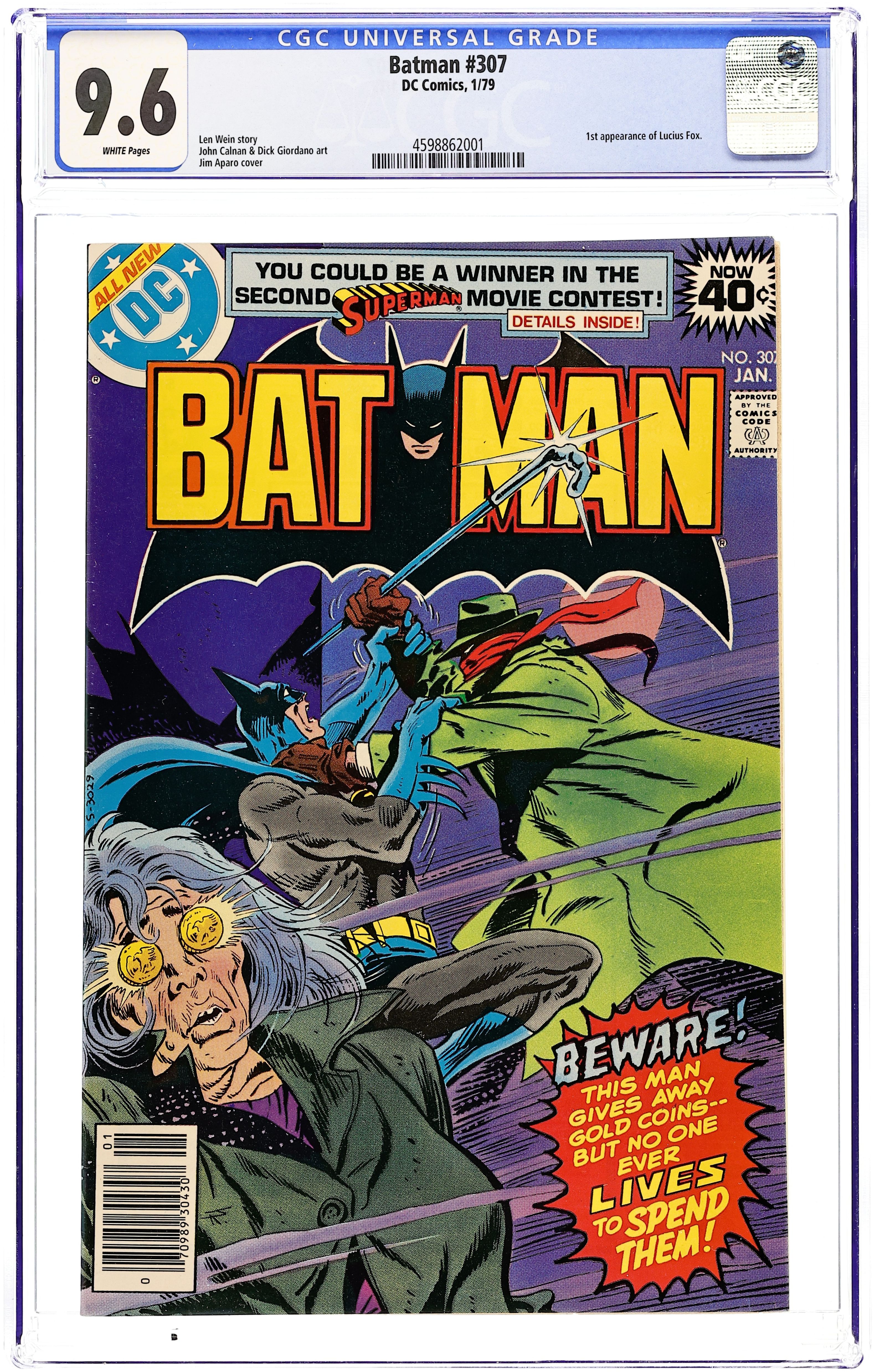 1st appearance of Lucius Fox. Cover art by Jim Aparo. "Dark Messenger of Mercy!", script by Len Wein, pencils by John Calnan, inks by Dick Giordano; Lucius Fox handles the day-to-day transactions of the Wayne Foundation to Fox free up Wayne's schedule for his Batman activities; Batman pursues a killer who places poisoned gold coins over his victims' eyes. Hostess snack cakes ad with Superman. Letter from comics write Cat Yronwode. Daily Planet Extra Volume 78 Issue 40 Week of October 9, 1978; Information on Superboy and the Legion of Super-Heroes #247, The Brave and the Bold #146, comics on sale the week of October 23, Ask the Answer Man! and Fred Hembeck strip featuring Elongated Man. 36 Pages, Full Color. Cover price $0.40. Grade: CGC 9.6 explanation of grade Condition: Used (collectible)