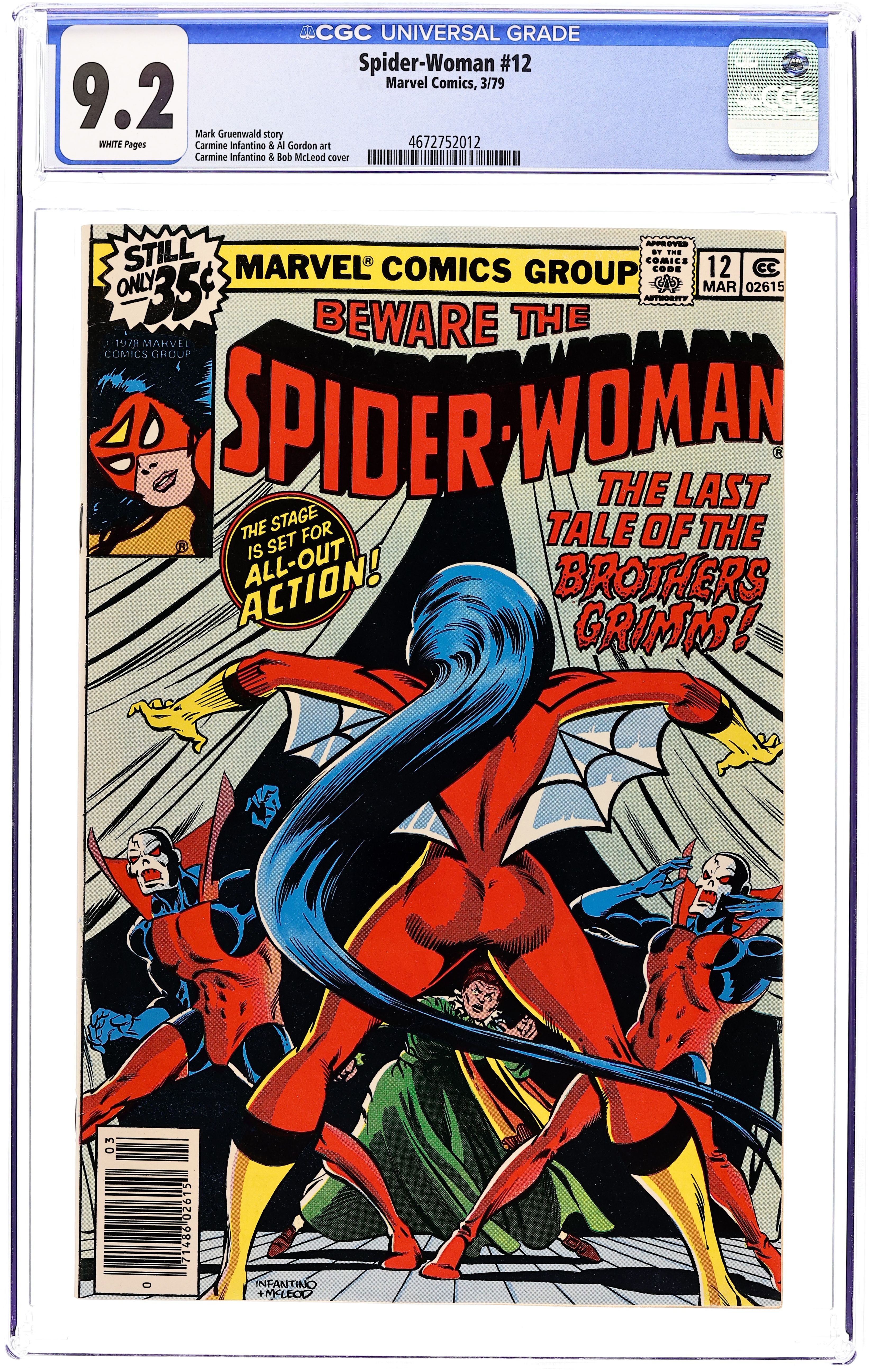 Starts Feb 2 Cover pencils by Carmine Infantino, inks by Bob McLeod. The Last Tale of the Brothers Grimm! starring Spider-Woman, script by Mark Gruenwald, pencils by Carmine Infantino, inks by Al Gordon; Madame Doll tries to revive her husband. 32 pgs. $0.35. Cover price $0.35. Grade: CGC 9.2 explanation of grade Condition: Used (collectible)