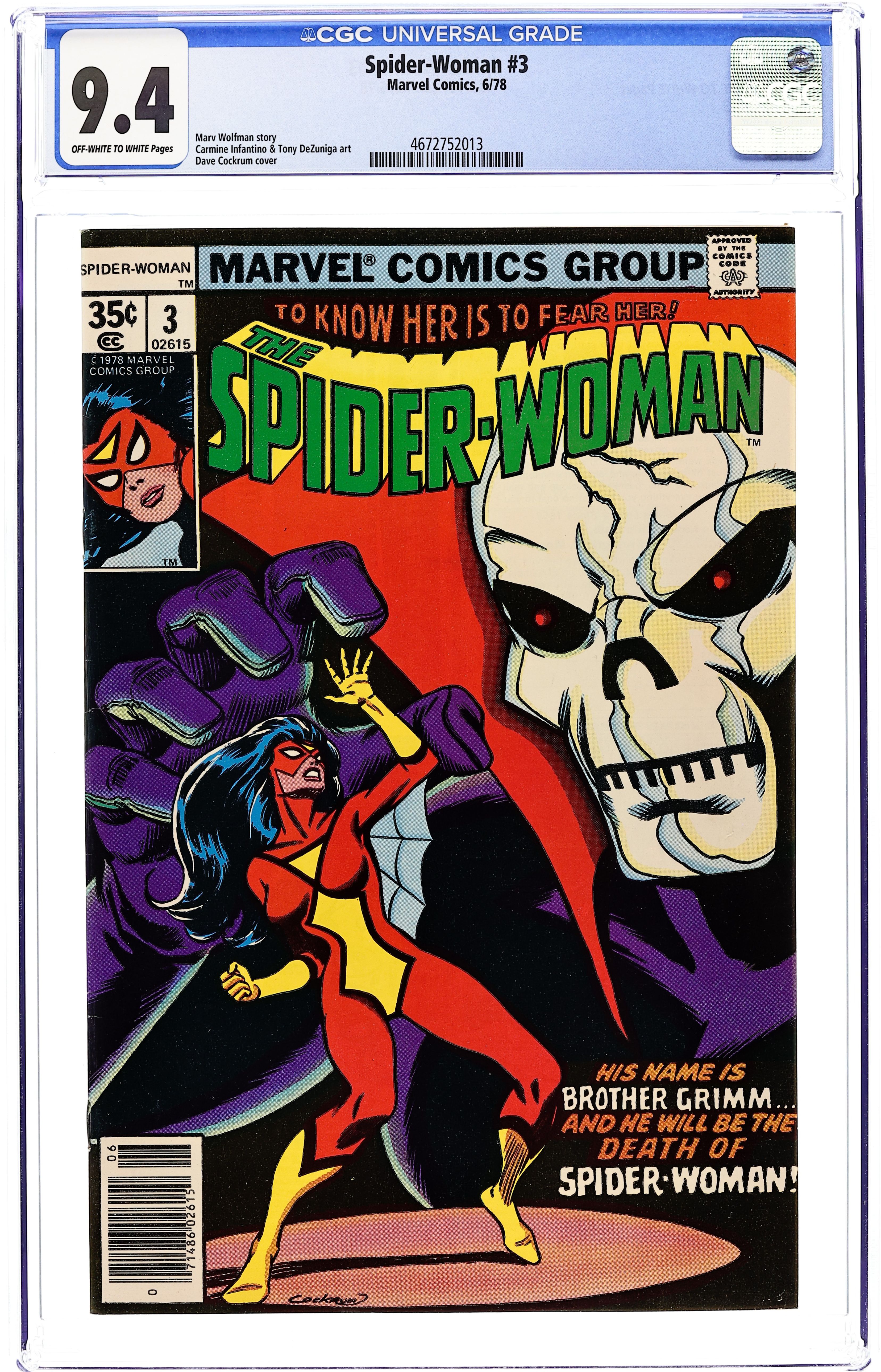 Starts Feb 2 Cover art by Dave Cockrum. The Peril of -- Brother Grimm, script by Marv Wolfman, pencils by Carmine Infantino, inks by Tony DeZuniga; Brother Grimm goes on a crime spree and Spider-Woman tries to stop him. 32 pgs. $0.35. Cover price $0.35. Grade: CGC 9.4 explanation of grade Condition: Used (collectible)