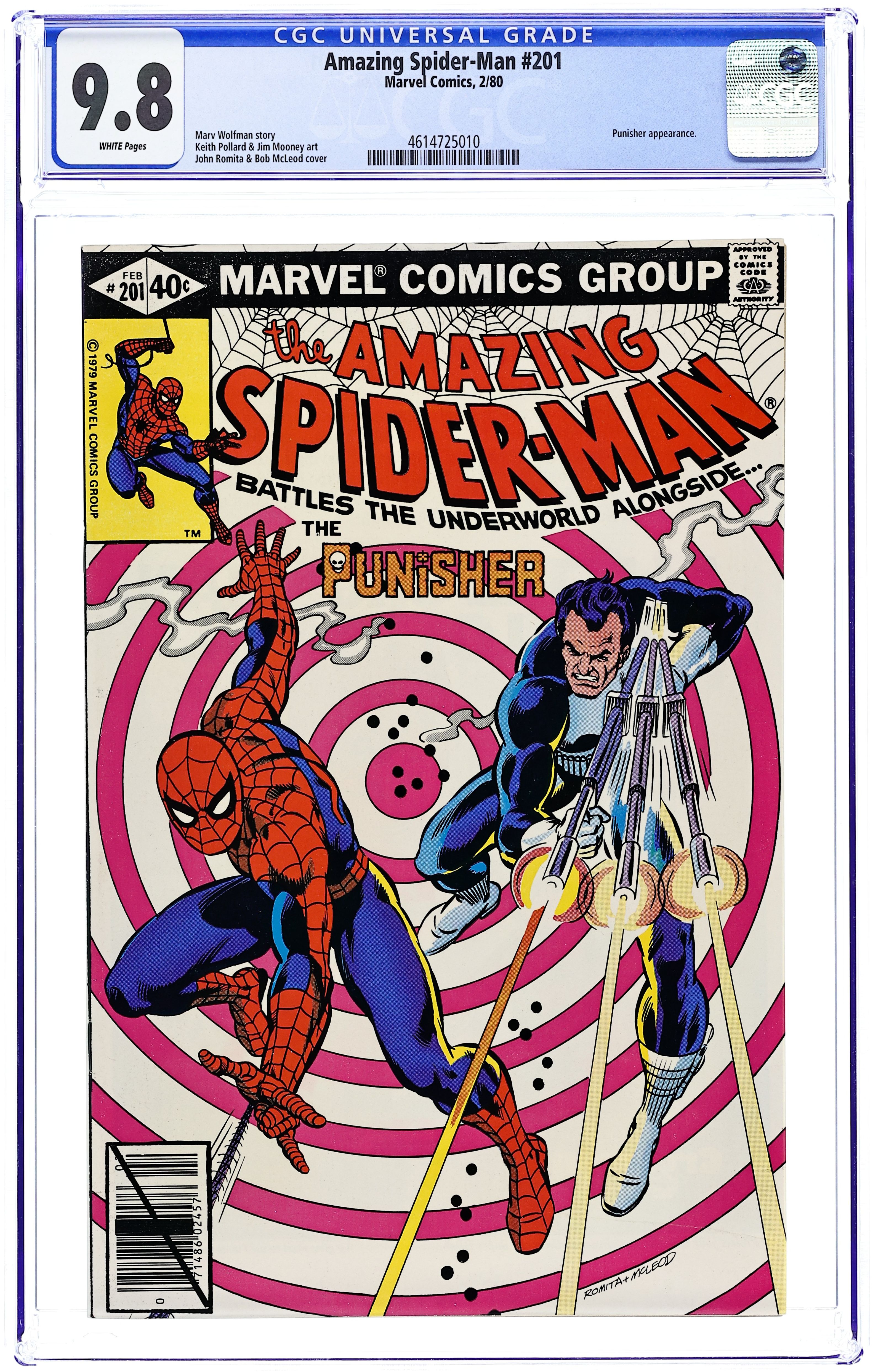Direct Edition. "Man-Hunt!" Part 1 of 2. Guest-starring the Punisher. Script by Marv Wolfman. Art by Keith Pollard (layouts) and Jim Mooney (finishes). Cover by John Romita and Bob McLeod. The action starts with a bang as the web-slinger catches a man falling out of a high-rise office building! When Spider-Man swings inside to investigate, he discovers the source of the problem: the Punisher! What has Frank Castle been up to since Spidey last saw him (in Amazing Spider-Man 175)? Oh, just business as usual...terrorizing the underworld! The following day to his surprise, the Punisher sees pictures of his penthouse gun battle in the Daily Globe! Credited to a photographer named Peter Parker! This troubles the Punisher! And that means trouble for Aunt May's nephew! War Journal Entry #519 is coming up next at a particular superhero's Chelsea apartment! Appearances by J. Jonah Jameson, Joe Robertson, Dr. Marla Madison, Aunt May, and Mary Jane Watson. (Notes: The Punisher previously appeared in Captain America 241. Mary Jane appears next in the classic Marvel Team-Up 79 where (as Red Sonja) she battles Kulan Gath alongside the web-slinger. This is one of Mary Jane's very few appearances between 1979 and 1983. She returns to the Amazing Spider-Man title in issue 238. This story was reprinted in Marvel Tales 218.) 36 pgs. Cover price $0.40. Grade: CGC 9.8 explanation of grade Condition: Used (collectible)