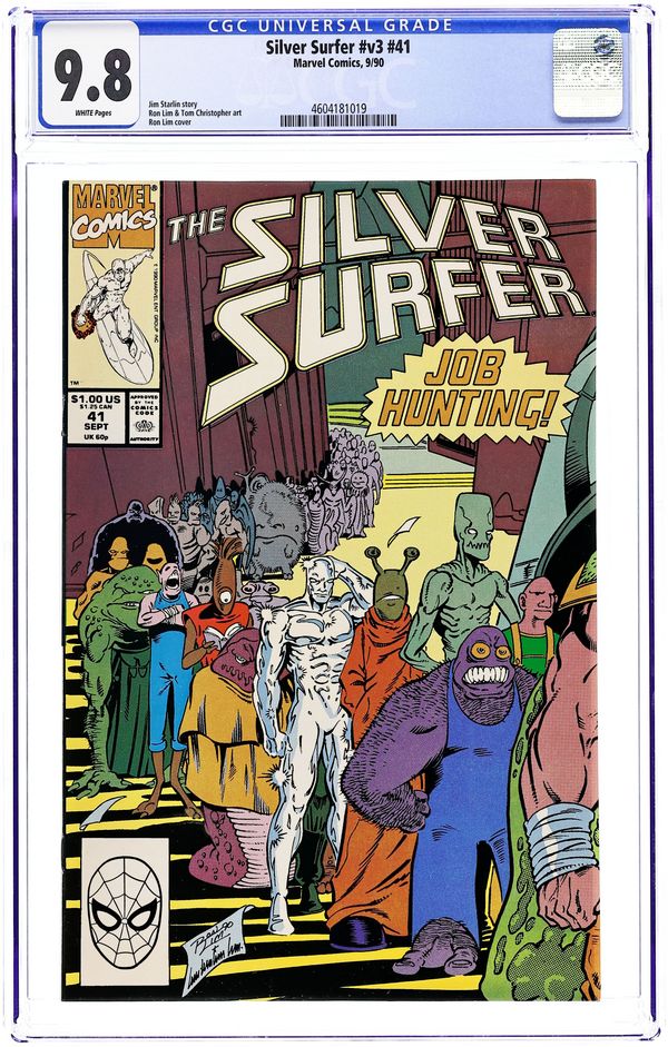 Direct Edition. "Job Hunting!" Featuring a 2-page splash page of all the heroes, villains, and supporting characters from the life of the Silver Surfer. Story by Jim Starlin. Art by Ron Lim and Tom Christopher. What would a former Herald of Galactus be doing standing in Dynamo City like some average Joe? What else...looking for work. Cover price $1.00. Grade: CGC 9.8 explanation of grade Condition: Used (collectible)