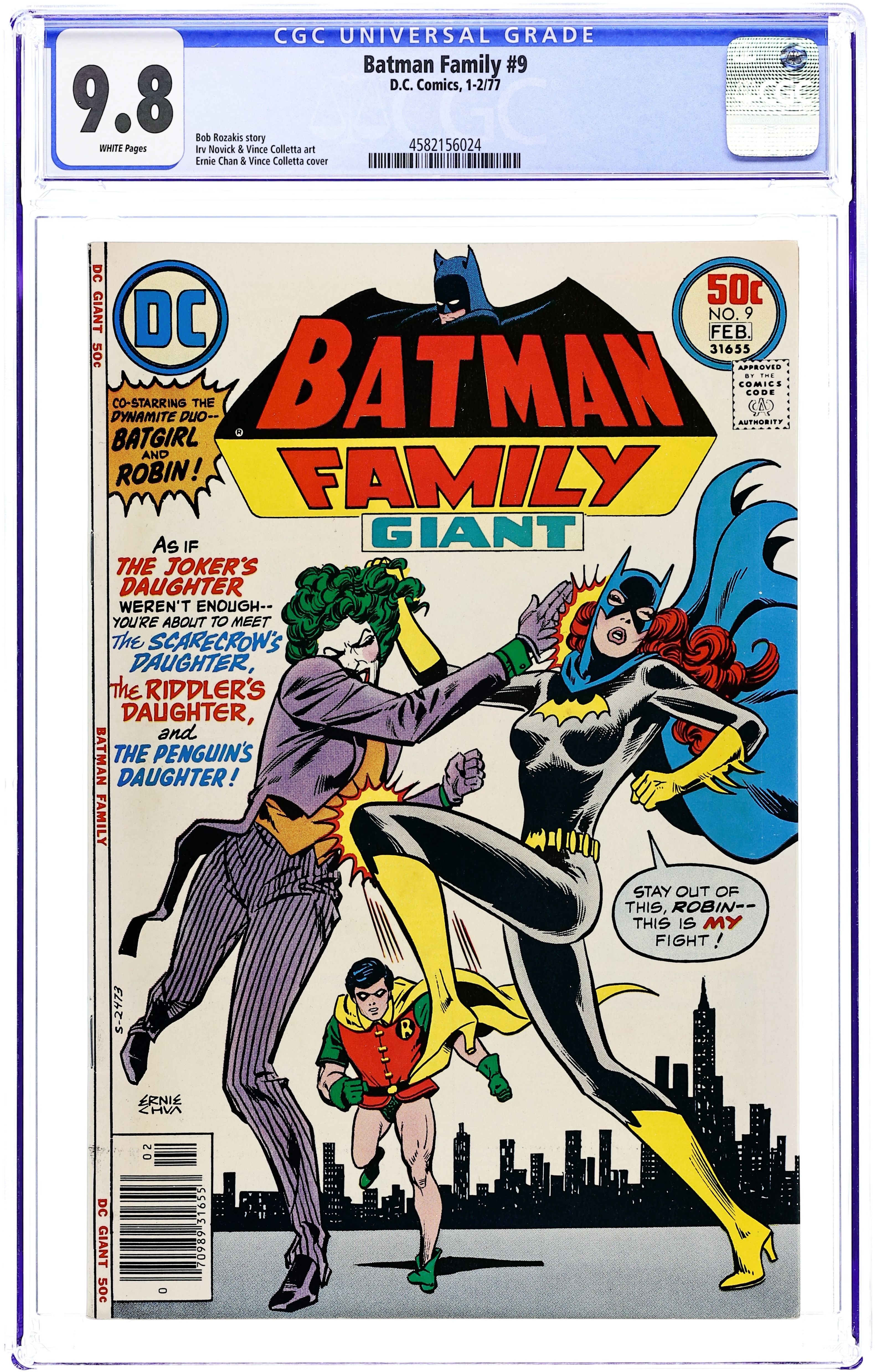 Giant-size issue. Batgirl and Robin have their hands full when they take on the daughters of the Joker, the Scarecrow, the Riddler, and the Penguin in "The Startling Secret of the Devilish Daughters!" Script by Bob Rozakis, pencils by Irv Novick, inks by Vince Colletta. Reprint back-up stories: Alfred stars in "Recipe for Revenge!" (art by Jerry Robinson); Batman and Robin star in "The Blockbuster Breaks Loose!" with script by Gardner Fox, pencils by Carmine Infantino, inks by Joe Giella. Ernie Chan (as "Ernie Chua") cover. 52 pages, full color. Cover price $0.50. Grade: CGC 9.8 explanation of grade Condition: Used (collectible)