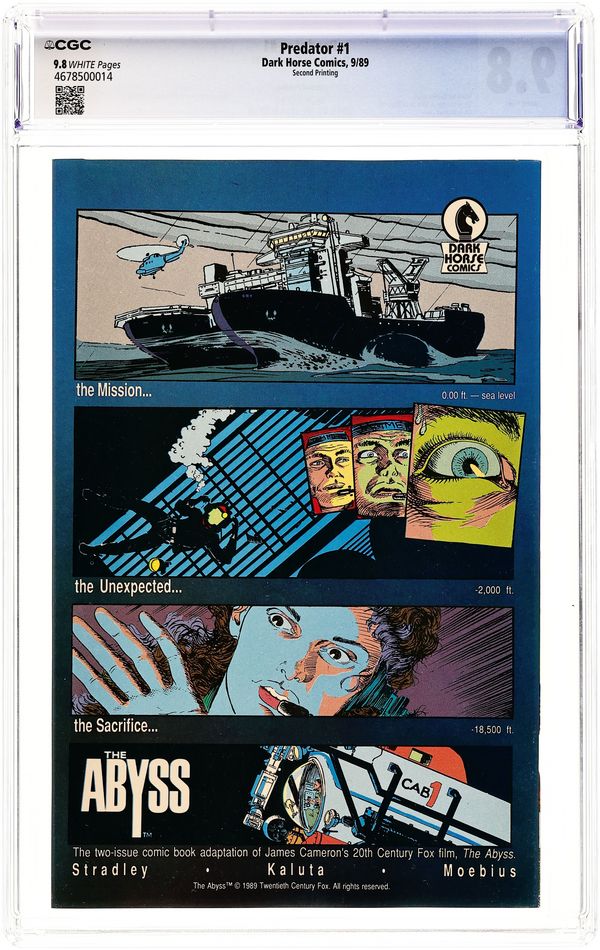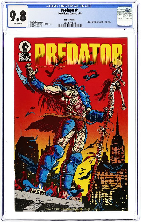 Second Printing. Written by Mark Verheiden. Art by Chris Warner and Sam de la Rosa. The Predators are back, only this time their hunting ground isn't the tropical jungles of South America--it's the concrete and street jungles of New York City! It's the hottest summer on record, and Detective Schaefer suspects that his brother's disappearance is somehow tied to the wave of gruesome murders plaguing New York! 32 pages, FC. Cover price $2.25. Grade: CGC 9.8 explanation of grade Condition: Used (collectible)