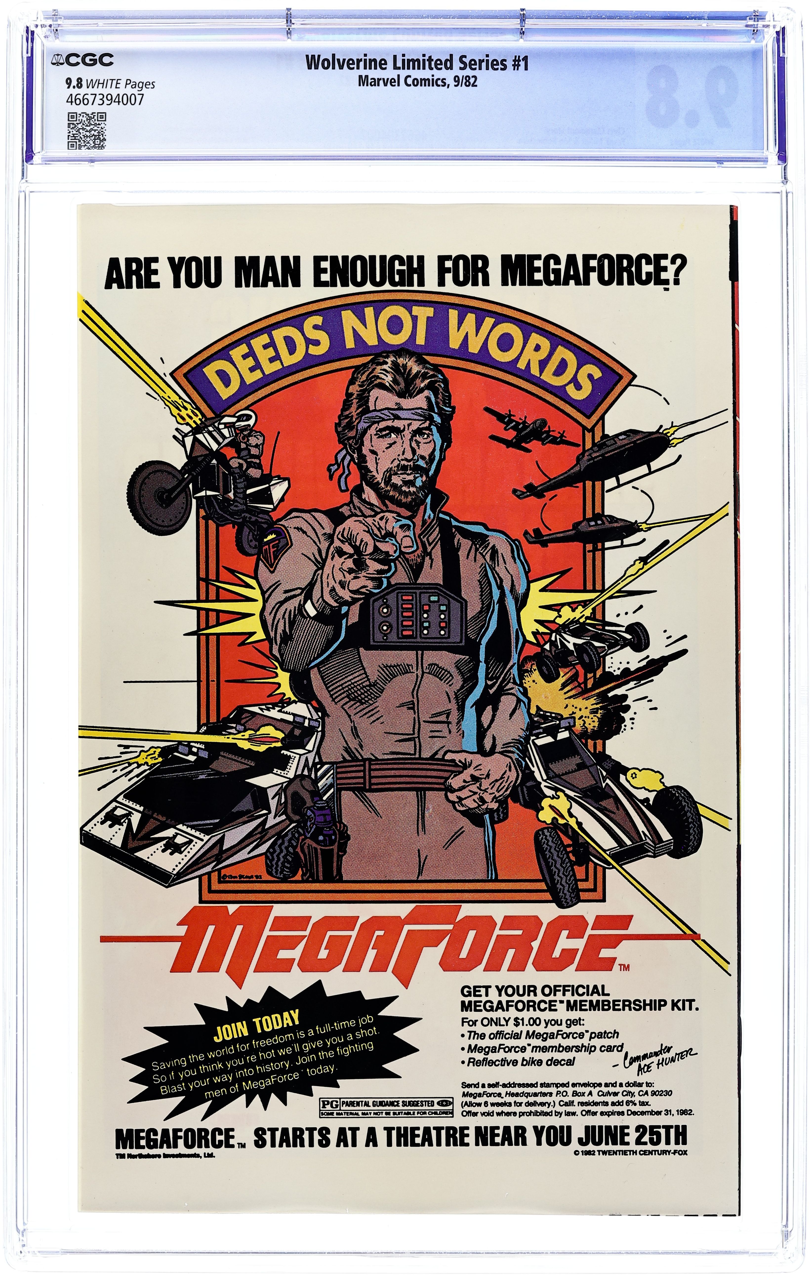 Direct Edition. 1 of 4 Featuring Wolverine in his first solo series fighting in Japan. "Wolverine." Script by Chris Claremont, pencils by Frank Miller, inks by Joe Rubinstein. Miller/Rubinstein cover. Back cover MegaForce ad with art by William Stout. Cover price $0.60. Grade: CGC 9.8 explanation of grade Condition: Used (collectible)