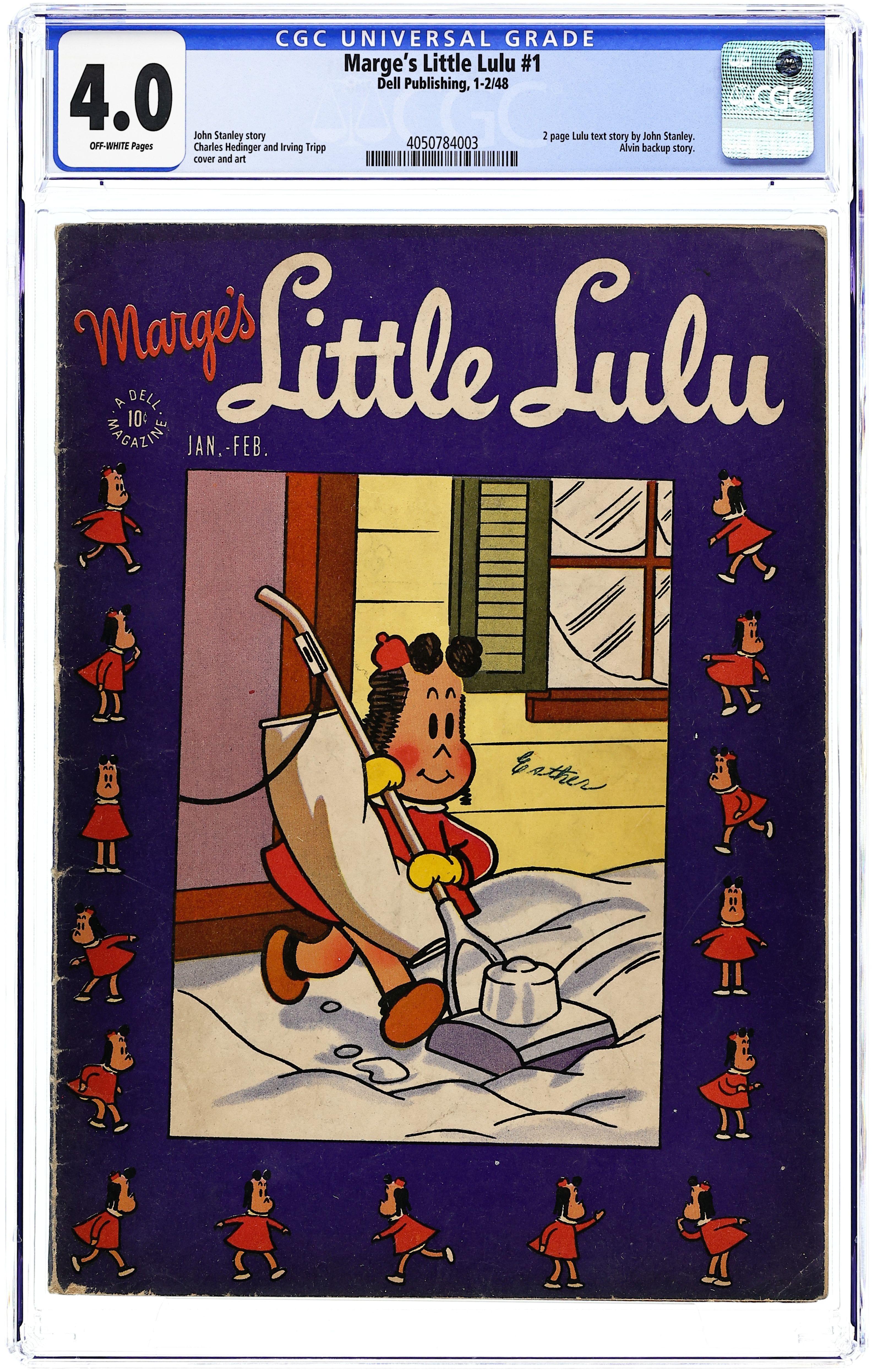 Cover pencils by Charles Hedinger, inks by Irving Tripp. Mountain Climbing, script by John Stanley, art by Charles Hedinger; Lulu and Tubby go mountain climbing up the side of a brick building. Lulus Diary (May 1948) text story. Bam! Bam!, script by John Stanley, pencils by Charles Hedinger, inks by Irving Tripp; Lulu, Tubby, and Alvin's noisy gun playing drives Mr. Gripe up the wall. The Lost Hat, script by John Stanley, pencils by Charles Hedinger, inks by Irving Tripp; Alvin loses his paper hat down a manhole. Tubby one-pager, script by John Stanley, pencils by Charles Hedinger, inks by Irving Tripp. 36 pages, full color. Cover price $0.10. Grade: CGC 4.0 explanation of grade Condition: Used (collectible)