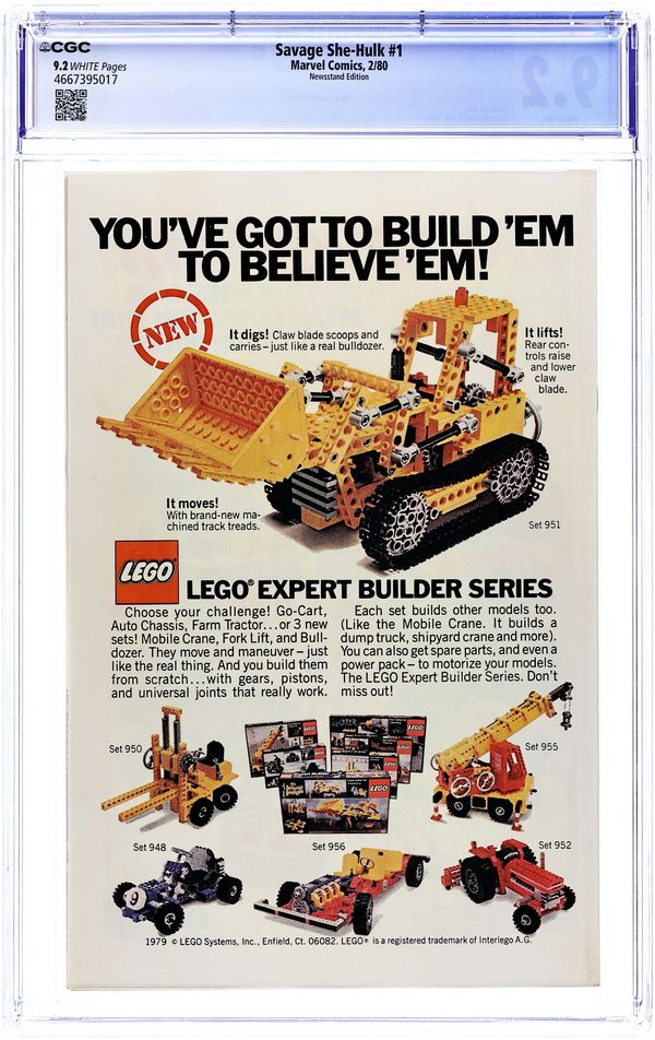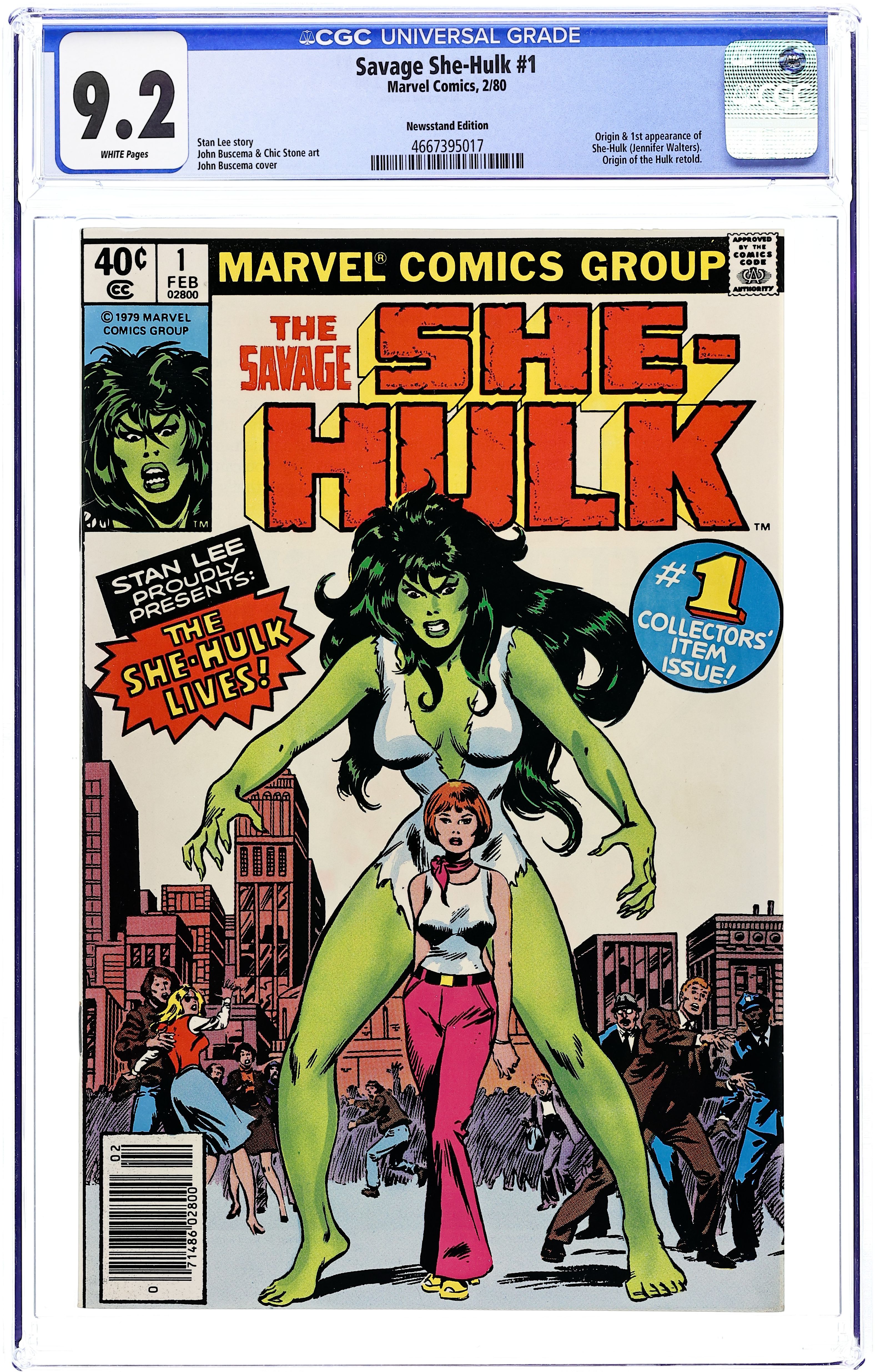 Newsstand Edition. 1st appearance and origin of the She Hulk. "The She-Hulk Lives!" Guest-starring Bruce Banner. Story by Stan Lee. Art by John Buscema and Chic Stone. Jennifer Walters is on the verge of death after an attempted assassination, and the only thing that will save her life is a blood transfusion from her cousin, Bruce Banner...AKA the Incredible Hulk! His gamma-irradiated blood sparks a startling transformation in his cousin, and she will forevermore be known as the Savage She-Hulk! Cover price $0.40. Grade: CGC 9.2 explanation of grade Condition: Used (collectible)