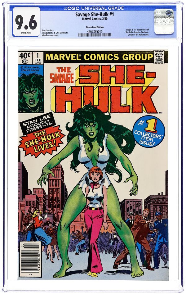Newsstand Edition. 1st appearance and origin of the She Hulk. "The She-Hulk Lives!" Guest-starring Bruce Banner. Story by Stan Lee. Art by John Buscema and Chic Stone. Jennifer Walters is on the verge of death after an attempted assassination, and the only thing that will save her life is a blood transfusion from her cousin, Bruce Banner...AKA the Incredible Hulk! His gamma-irradiated blood sparks a startling transformation in his cousin, and she will forevermore be known as the Savage She-Hulk! Cover price $0.40. Grade: CGC 9.6 explanation of grade Condition: Used (collectible)