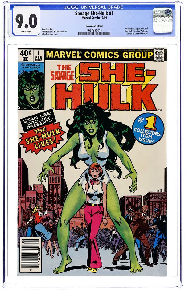 Newsstand Edition. 1st appearance and origin of the She Hulk. "The She-Hulk Lives!" Guest-starring Bruce Banner. Story by Stan Lee. Art by John Buscema and Chic Stone. Jennifer Walters is on the verge of death after an attempted assassination, and the only thing that will save her life is a blood transfusion from her cousin, Bruce Banner...AKA the Incredible Hulk! His gamma-irradiated blood sparks a startling transformation in his cousin, and she will forevermore be known as the Savage She-Hulk! Cover price $0.40. Grade: CGC 9.0 explanation of grade Condition: Used (collectible)