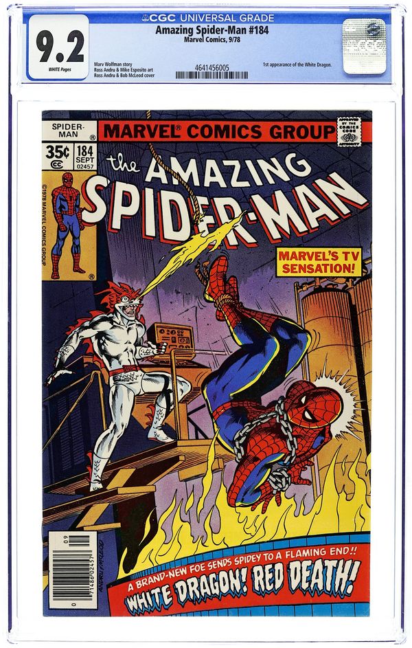 "White Dragon! Red Death!" Part 1 of 2. Script by Marv Wolfman. Pencils by Ross Andru. Inks by Frank Giacoia. Cover by Ross Andru and Bob McLeod. A disappointed Peter Parker walks back to his apartment and discovers Betty Brant (Leeds) inside! Hold on, didn't Betty marry Ned Leeds several months ago (in Amazing Spider-Man 156)? Yes, but now she's interested in Mr. Parker again! However, before the web-slinger can tend to his affairs of the heart, he must tend to business in Chinatown! And as depicted on the dramatic cover, that business may be dangerous, fiery, lethal, or all of the above! First appearances of Phillip Chang and the White Dragon II. Cameo appearances by J. Jonah Jameson, Dr. Marla Madison, and John Jameson. 36 pages Cover price $0.35. Grade: CGC 9.2 explanation of grade Condition: Used (collectible)