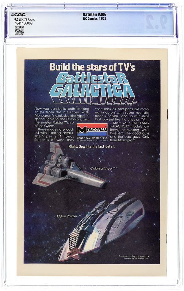 First standard-priced 40-cent cover issue. Cover by Jim Aparo. "Night of Siege," script by Gerry Conway, pencils by John Calnan, inks by Dave Hunt; An ex-junkie costumed vigilante called The Black Spider tries to kill dope dealer Hannibal Hardwicke; Batman saves Hardwicke and takes him to Bruce Wayne's penthouse apartment for safekeeping; The Black Spider battles past Batman into the apartment. "The Mystery Murderer of Mrs. Batman!", script by Bob Rozakis, pencils by Don Newton, inks by Dave Hunt; A freezing gas in Jeff Richter's suit immobilizes Batman and Alfred; Batman checks Richter's fingerprints and discovers that each finger bears the print of a different criminal. Battlestar Galactica Monogram model kit ad on back cover. 36 Pages, Full Color. Cover price $0.50. Grade: CGC 9.2 explanation of grade Condition: Used (collectible)