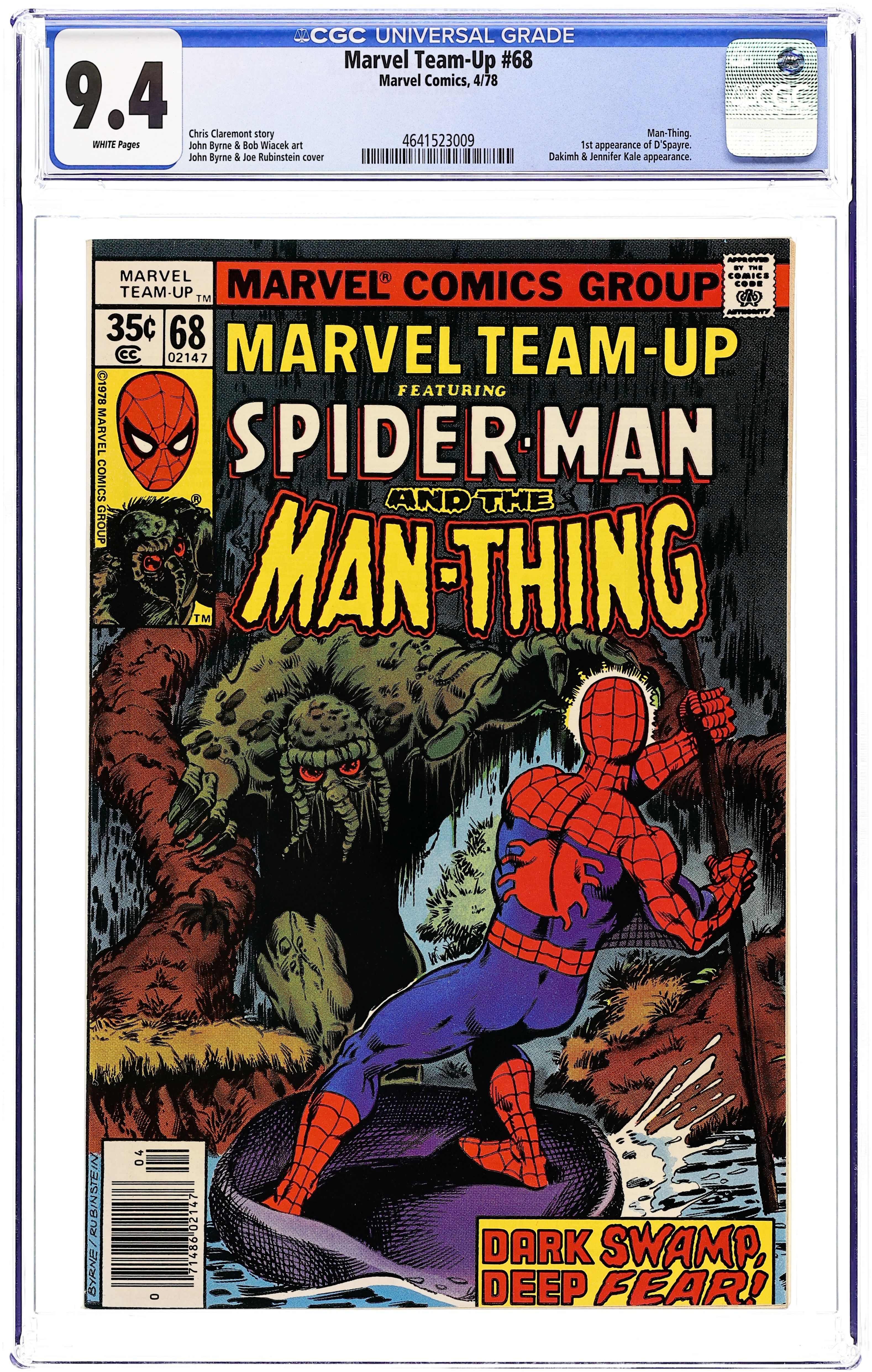 "The Measure of a Man!" Guest-starring Spider-Man and the Man-Thing. Script by Chris Claremont. Pencils by John Byrne. Inks by Bob Wiacek. Cover by John Byrne and Joe Rubinstein. Peter Parker and Mary Jane Watson are visiting the circus, when they notice a sad-looking creature imprisoned in a glass cage. It's the Man-Thing! What is he doing in New York? After nightfall, a sympathetic Spider-Man returns to the circus and frees his friend. The trip back to the Everglades is going smoothly until the plane crashes in the Florida swamp! One thing leads to another...and the web-slinger, Man-Thing, and Jennifer Kale wage a savage battle for survival against a new evil villain...D'Spayre! An outstanding story! First appearance of D'Spayre. (Notes: The letters page includes a letter from comics writer Michael Higgins. The back inside cover contains a Star Wars ad with Neal Adams art. This story was reprinted in Marvel Tales 204.) 36 pages. Cover price $0.35. Grade: CGC 9.4 explanation of grade Condition: Used (collectible)