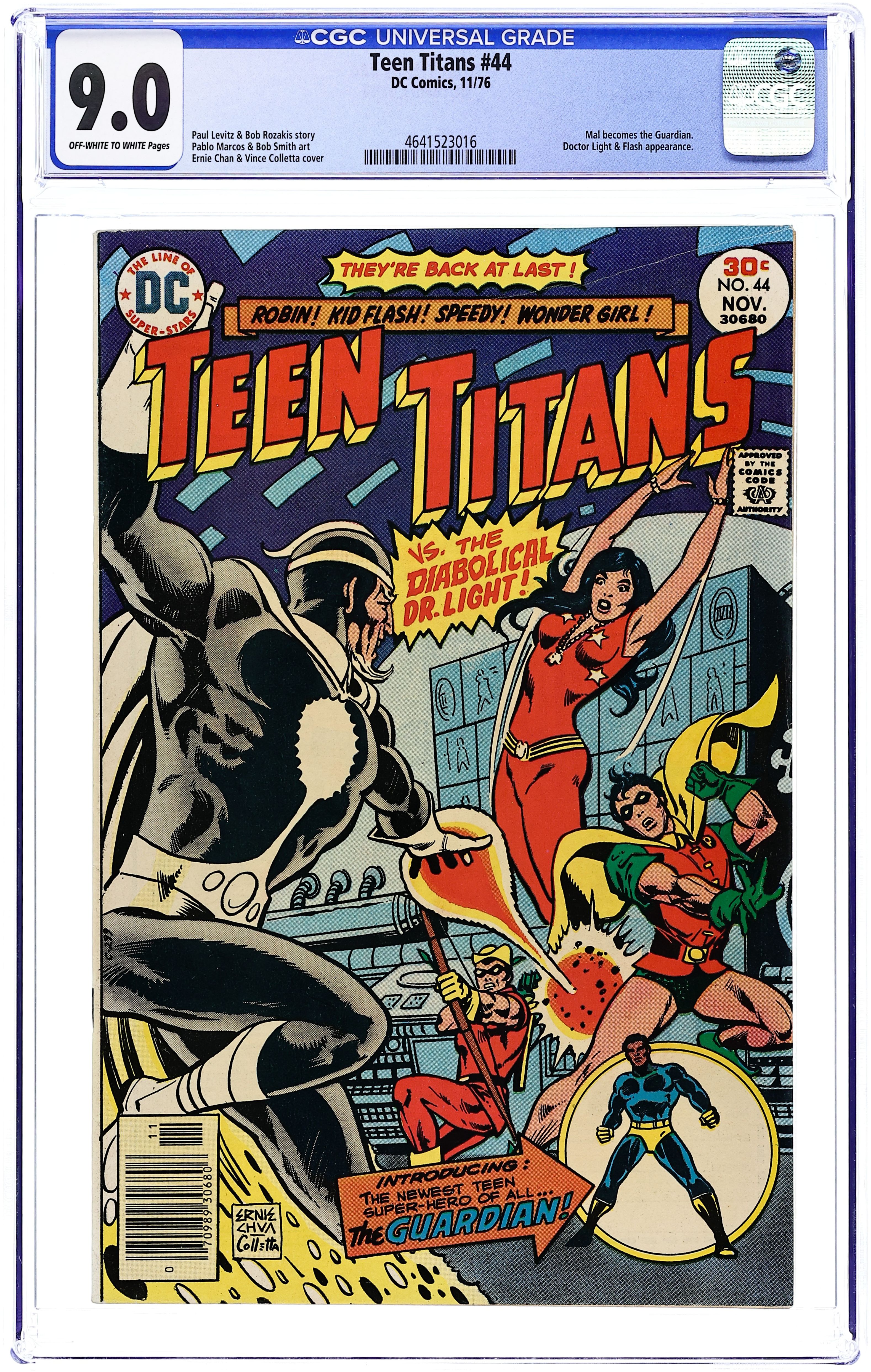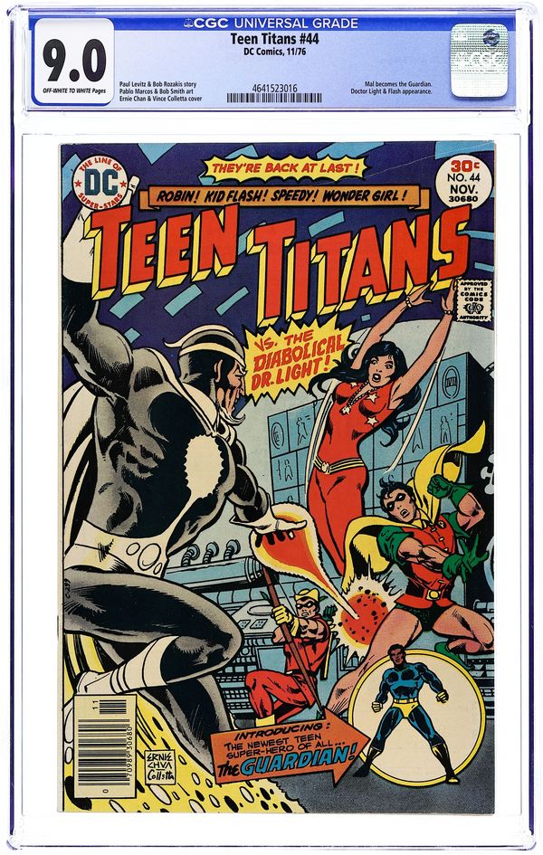 First 30c cover-priced issue. Written by Paul Levitz and Bob Rozakis. Art by Pablo Marcos and Bob Smith. Cover by Ernie Chan and Vince Colletta. Dr. Light traps and defeats the disbanded Titans until Mal becomes the Guardian to turn the tables. Speedy revealed to be nephew of Golden Age Guardian. First appearance of Karen Beecher. 36 Pages, Full Color. Cover price $0.30. Grade: CGC 9.0 explanation of grade Condition: Used (collectible)