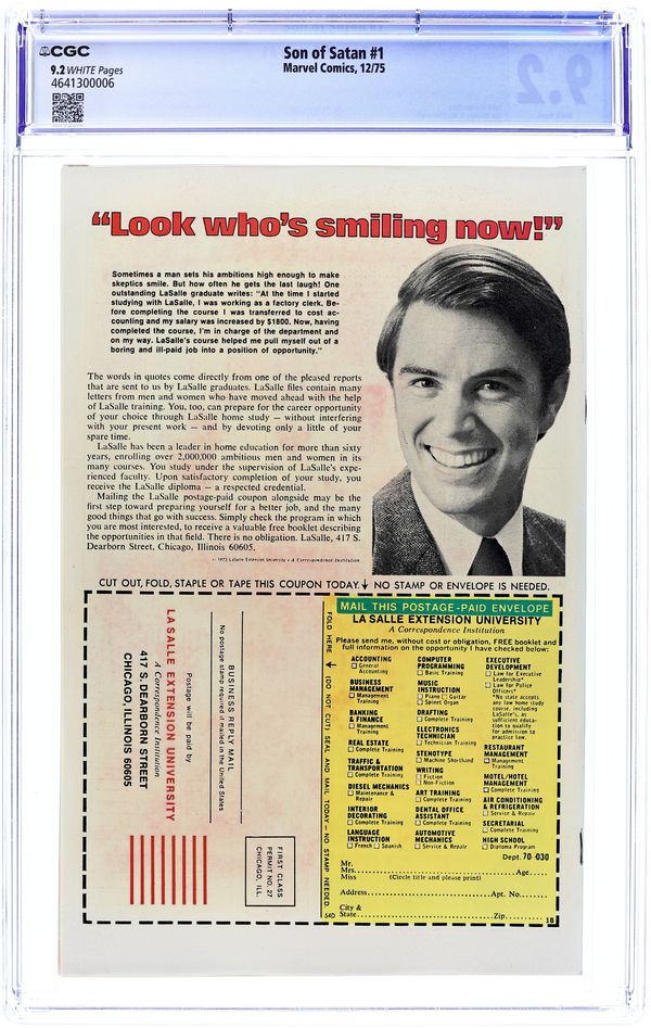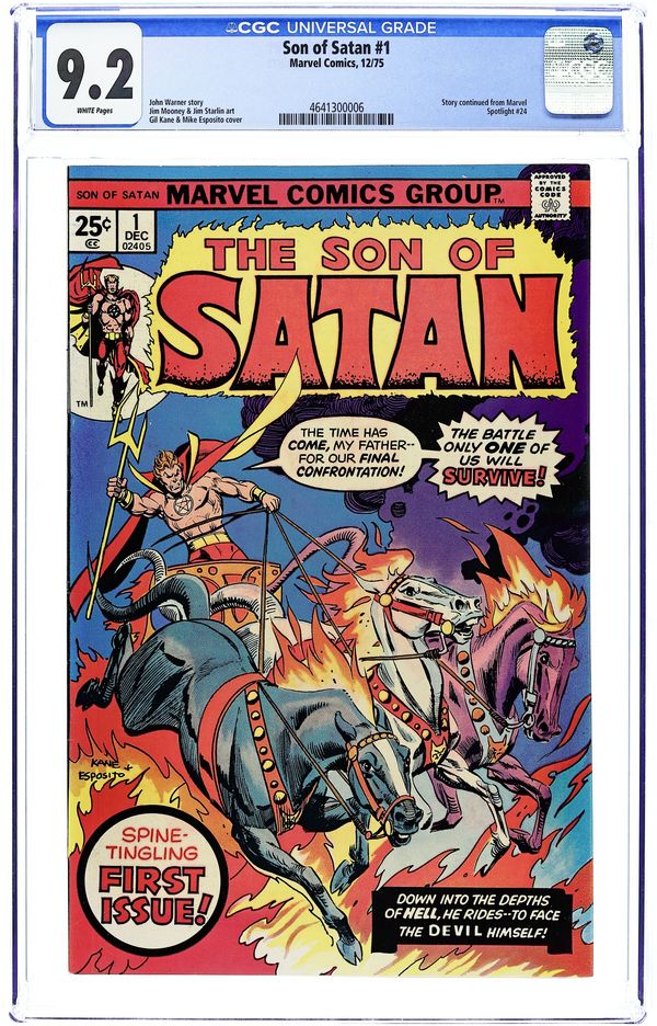"The Homecoming." Script by John Warner, art by Jim Mooney. Splash page pencilled by Jim Starlin. Daimon Hellstrom is the son of Satan, born of a human mother, so his two natures are constantly at war. A warrior of God, he seeks to destroy his father's minions lest they consume the world of man. The letters page includes Marvel Value Stamp series A # 13 (Dr. Strange by Steve Ditko). The Hulk stars in a one-page Hostess ad, "The Twins of Evil!" Gil Kane cover pencils, Mike Esposito cover inks. Cover price $0.25. Grade: CGC 9.2 explanation of grade Condition: Used (collectible)