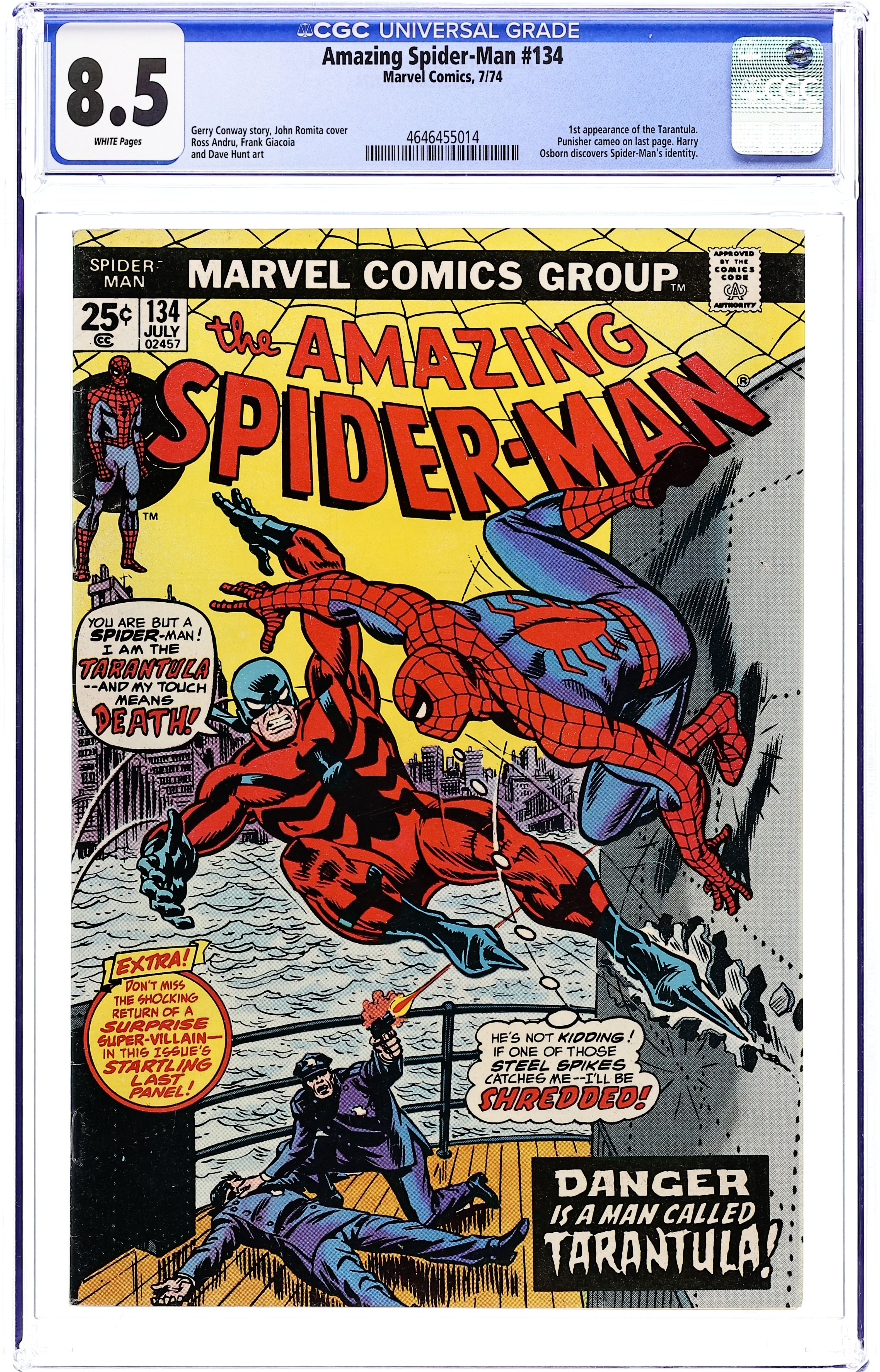 Starts Feb 2 Cover by John Romita Sr. First appearance of Tarantula, plus cameos by the Punisher, Doctor Octopus, and the Molten Man in Danger Is a Man Named...Tarantula, script by Gerry Conway, pencils by Ross Andru, inks by Frank Giacoia and Dave Hunt; Peter takes a day of leisure to go on a cruise with MJ, Flash, and Liz Allan; While onboard, a masked mercenary attacks!; Harry Osborn discovers Peters greatest secret! Letter to the editor from Ralph Macchio. The letters page also has Marvel Value Stamp series A # 3 (Conan the Barbarian). Reprinted in Marvel Tales # 111 and 210. 36 pgs., full color. $0.25. Cover price $0.25. Grade: CGC 8.5 explanation of grade Condition: Used (collectible)
