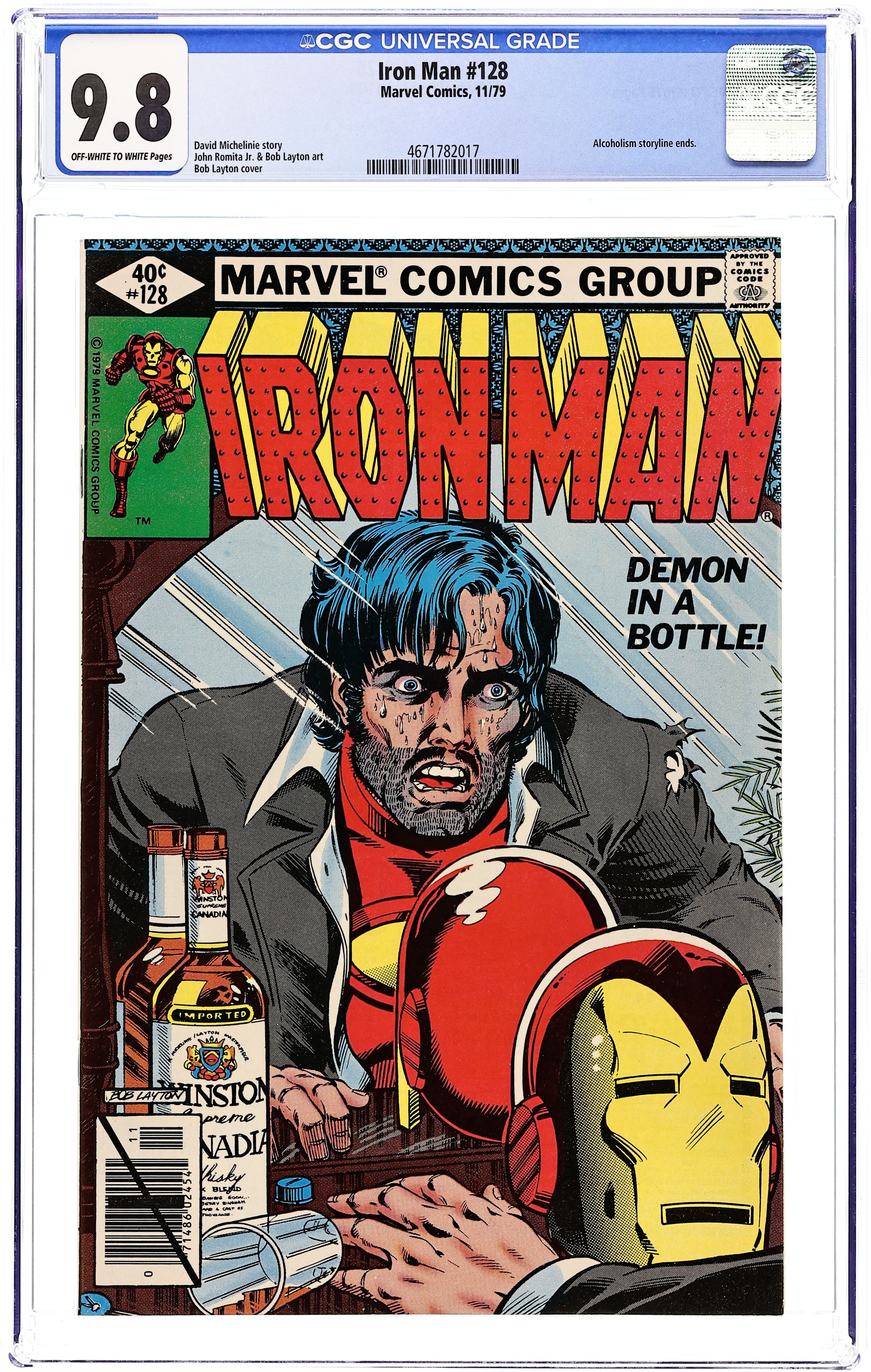 Direct Edition. "Demon in a Bottle" Plot by David Michelinie and Bob Layton. Script by David Michelinie. Art by John Romita Jr. (breakdowns) and Bob Layton (finishes). Cover by Bob Layton. One of the most critically acclaimed Iron Man stories, "Demon in a Bottle" explores the flaws of the man behind the helmet. Tony Stark's struggle with alcoholism comes to a head in this pull-no-punches look at his problem. Appearances by Bethany Cabe and Jarvis. (Note: This issue was reprinted in 2006 in the trade paperback: Iron Man Demon in a Bottle; and again in 2008 in the hardcover: Iron Man Demon in a Bottle.) 32 pages. Cover price $0.40. Grade: CGC 9.8 explanation of grade Condition: Used (collectible)