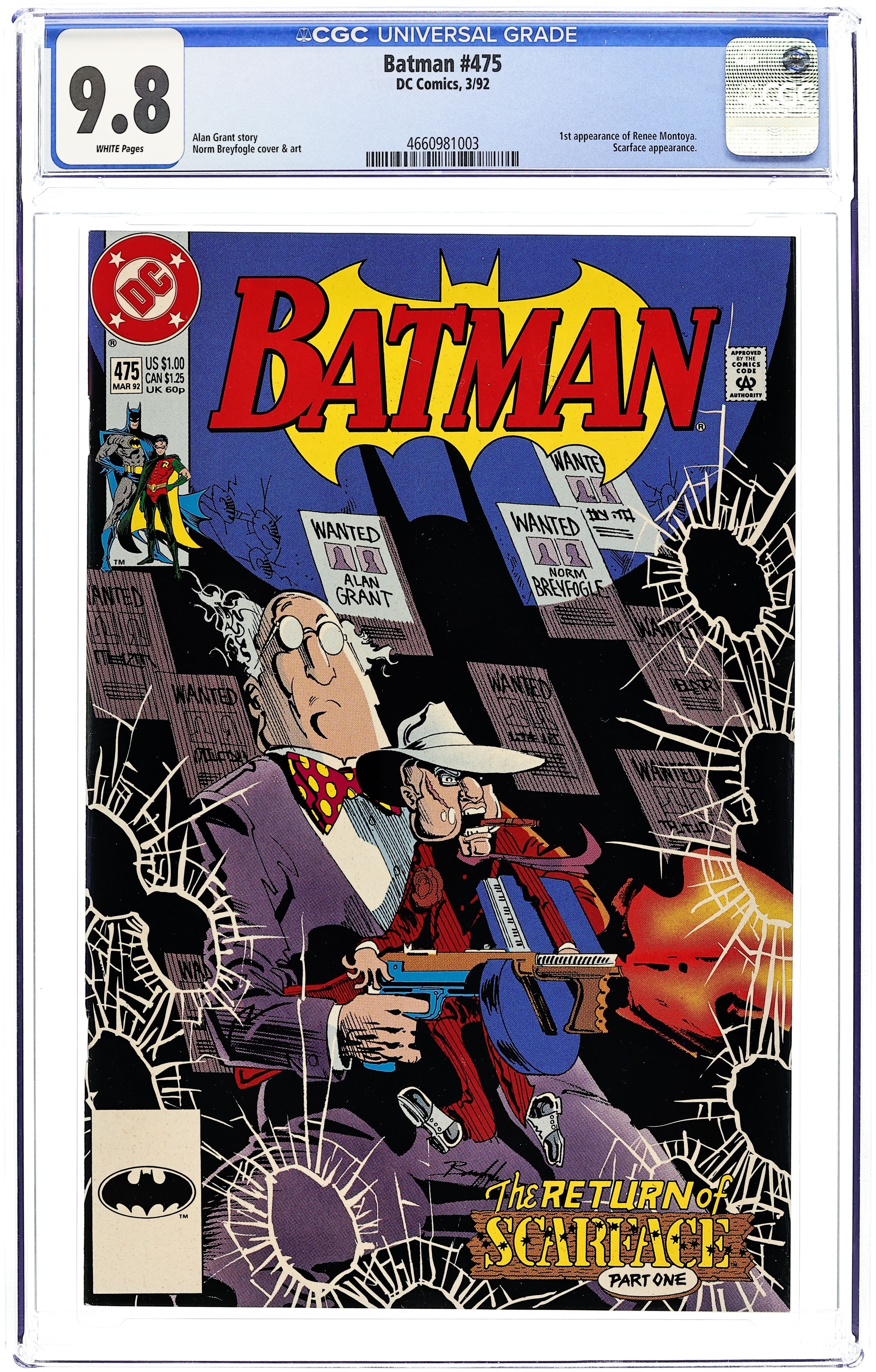 "Mustache Pete is Dead!" Pt. 1. Story by Alan Grant. Art by Norm Breyfogle. Fresh out of jail, the Ventriloquist and Scarface hit the streets looking to renew their scandalous ways. However, a new gang of toughs have moved into their old territory and are not looking to share the wealth. Scarface is beaten, broken and left for dead. Feeling free for the first time in a long time, the Ventriloquist soon learns that some devils refuse to go quietly into the night. Story continues in Detective Comics 642. Also, Vickie Vale gets a new partner who turns out to be much more then he appears. And, we are introduced to Officer Rene Montoya, a character that will become very prominent in the Batman Animated Series and later Gotham Central. 36 Pages, Full Color. Cover price $1.00. Grade: CGC 9.8 explanation of grade Condition: Used (collectible)