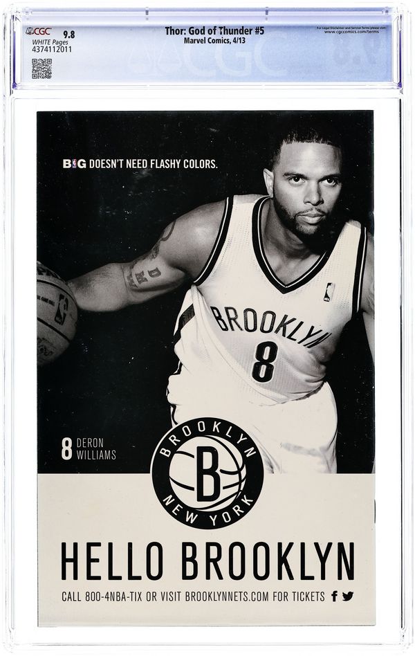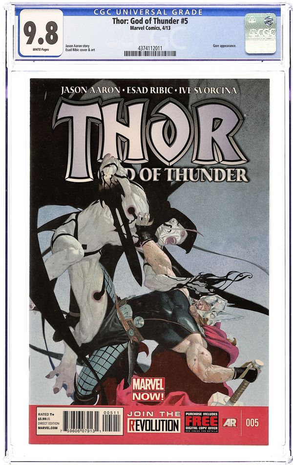 Cover by Esad Ribic (W) Jason Aaron (A) Esad Ribic The shocking finale of our opening salvo...! As three Thors from three eras race to stop the God Butcher, the full extent of his vicious scheme takes terrifying shape. Cover price $3.99. Grade: CGC 9.8 explanation of grade Condition: Used (collectible)