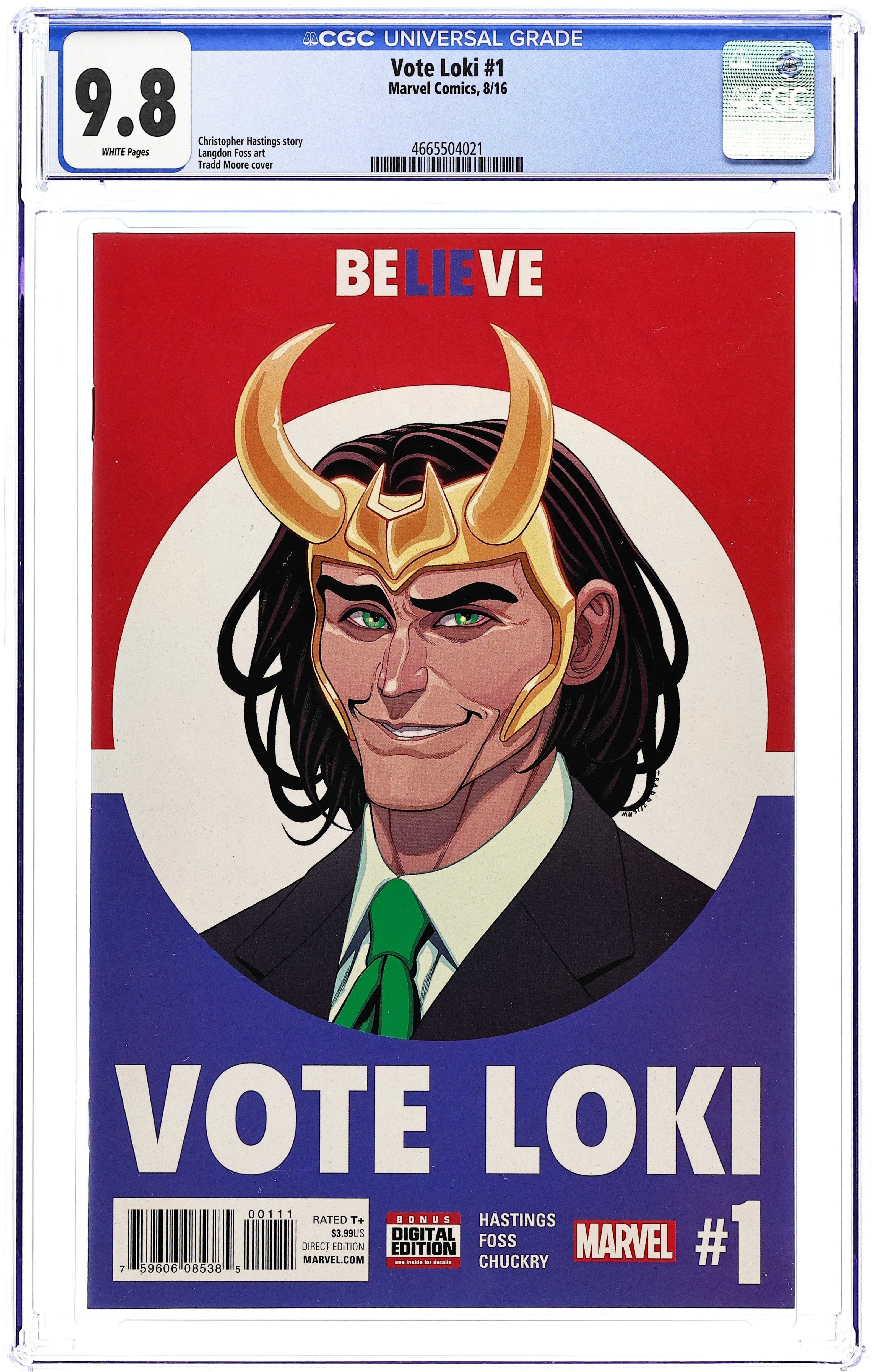 Written by Christopher Hastings. Art by Langdon Foss. Cover by Tradd Moore. Loki is many things -- god, trickster, brother, liar, son, villain, even hero. Now he wants to add one more thing to the list: President of the United States. That's right, the God of Lies has set his sights on becoming the ruler of the free world, but is this just another scheme? One thing's for certain -- with Loki's winning smile and silver tongue on the campaign trail, this election just got a lot more interesting… 28 pages, full color. Rated T+ Cover price $3.99. Grade: CGC 9.8 explanation of grade Condition: Used (collectible)