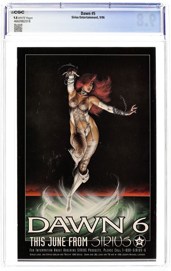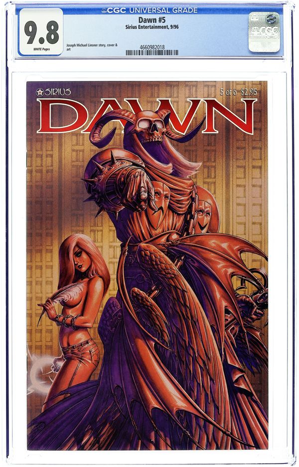 Lucifer's Halo Part 5. Darrian has a heart-to-heart with Adelle, demons battle angels, the Horned God makes his presence felt and Dawn provides some answers in "Everybody Dies." Story, art & cover by Joseph Michael Linsner. Cover price $2.95. Grade: CGC 9.8 explanation of grade Condition: Used (collectible)