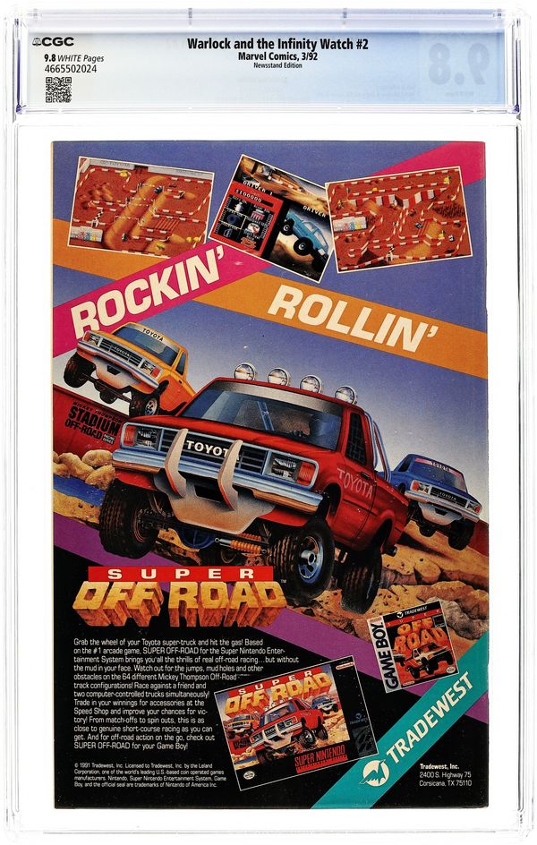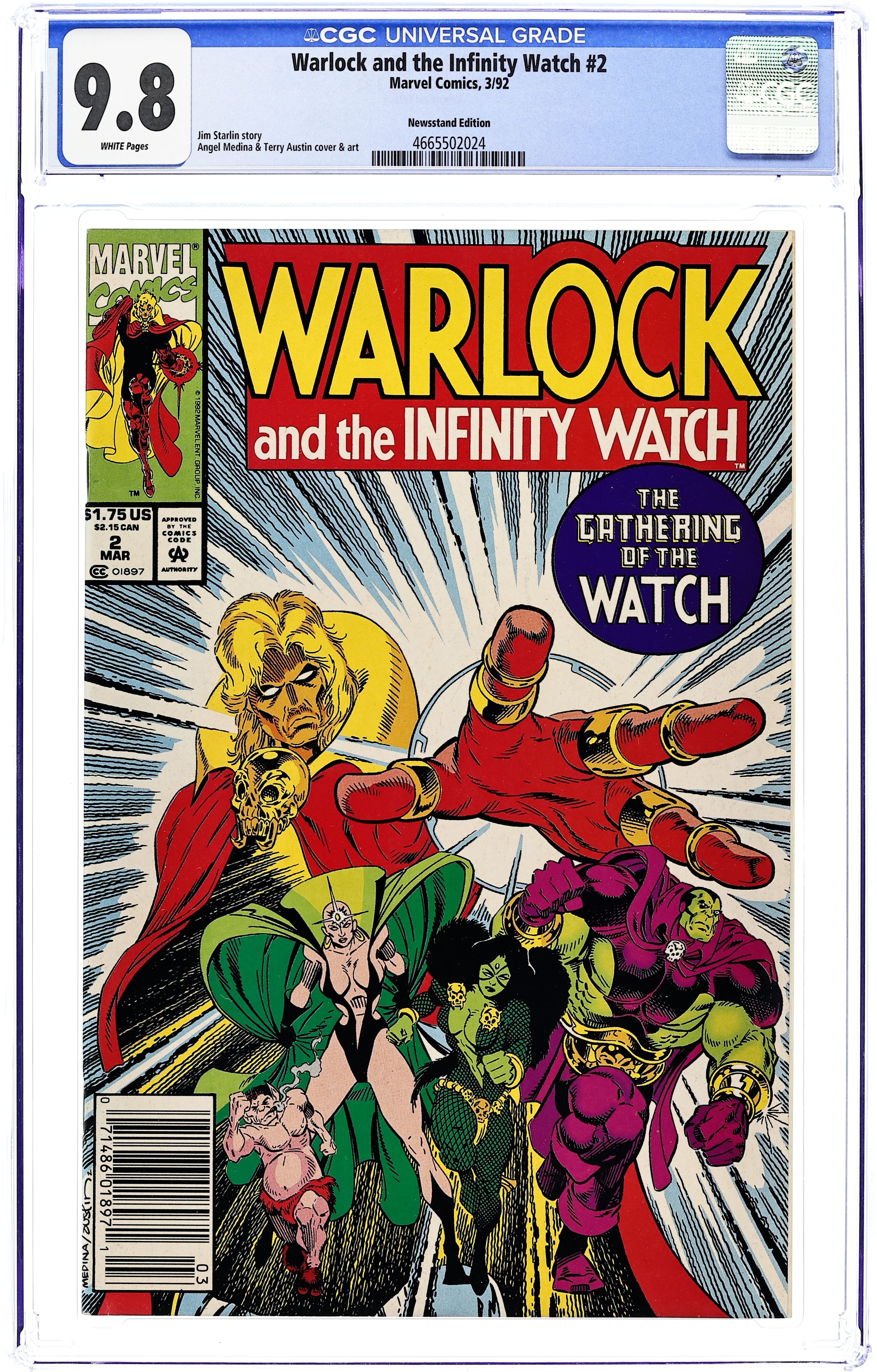 Newsstand Edition. "Gathering the Watch!" Starfox cameo. Story by Jim Starlin. Art by Angel Medina and Terry Austin. Deemed too powerful to reside together, Adam Warlock must dismantle the Infinity Gauntlet and separate the Infinity Gems. But, each gem on it's own is still the too powerful to fall into the wrong hands, thus Warlock must gather an Infinity Watch. Guardians whom he can entrust the ultimate powers over Space, Time, Power, Reality, the Mind, and the Soul. 32 pages. Cover price $1.75. Grade: CGC 9.8 explanation of grade Condition: Used (collectible)