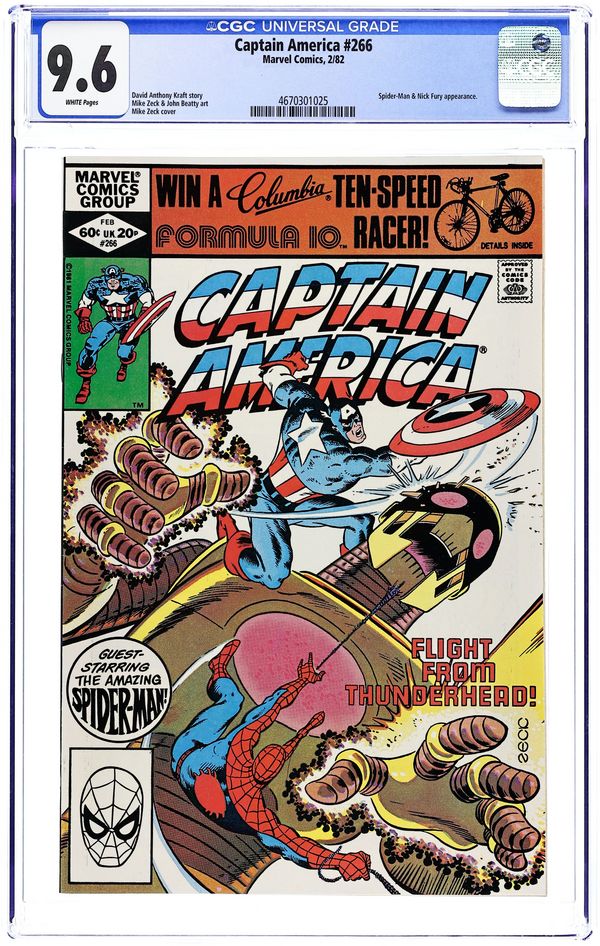 Starts Feb 2 Direct Edition. "Flight From Thunderhead!" Part 2 of 2. Guest-starring Spider-Man and Nick Fury. Script by David Anthony Kraft. Art by Mike Zeck (breakdowns) and John Beatty (finishes). Cover by Mike Zeck. The star-spangled avenger and the Amazing Spider-Man wage a fierce battle against Sultan and his biotron constructs -- in order to stop the Sultan's plan to conquer the Earth! In the meantime, Nick Fury dangles from a nuclear missile already launched towards Washington D.C.! How are the heroes going to prevent a global catastrophe? 36 pages. Cover price $0.60. Grade: CGC 9.6 explanation of grade Condition: Used (collectible)