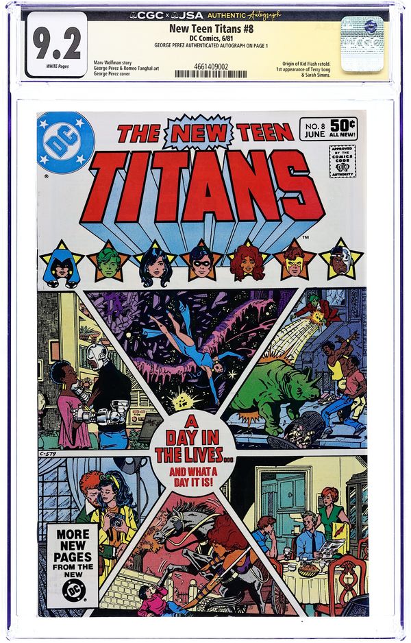 Direct Edition. It's a look at the eventful, private lives of the Titans in "A Day In The Lives..." Script by Marv Wolfman, pencils by George Perez, inks by Romeo Tanghal. Perez cover. Cover price $0.50. Grade: CGC 9.2 explanation of grade Condition: Used (collectible)