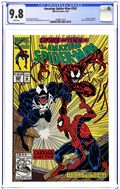 Starts Jan 19 First Printing. Direct Edition. "Savage Alliance!" Part 2 of 3. Guest-starring the Human Torch. Script by David Michelinie. Pencils by Mark Bagley. Inks by Randy Emberlin. Cover by Mark Bagley and Randy Emberlin. After getting a taste of Carnage's raw power last issue, the wall-crawler knows he needs serious help! To that end the amazing one does the unthinkable! He pays a visit to Venom! Wow, is that a good idea? However as a precaution the web-slinger brings Johnny Storm along for the ride to Venom's deserted island! And following an intense battle, Venom surprisingly agrees to help his good pal Spidey! So in a truly unlikely pairing, the Spectacular Spider-Man and the Lethal Protector join forces to take down Carnage! You have to see it to believe it! Cameo appearance by J. Jonah Jameson. (Note: The issue includes a full-page ad for the Toxic Crusaders (1992) series with art by Sam Kieth.) 36 pages. $1.25 cover price. Cover price $1.25. Grade: CGC 9.8 explanation of grade Condition: Used (collectible)