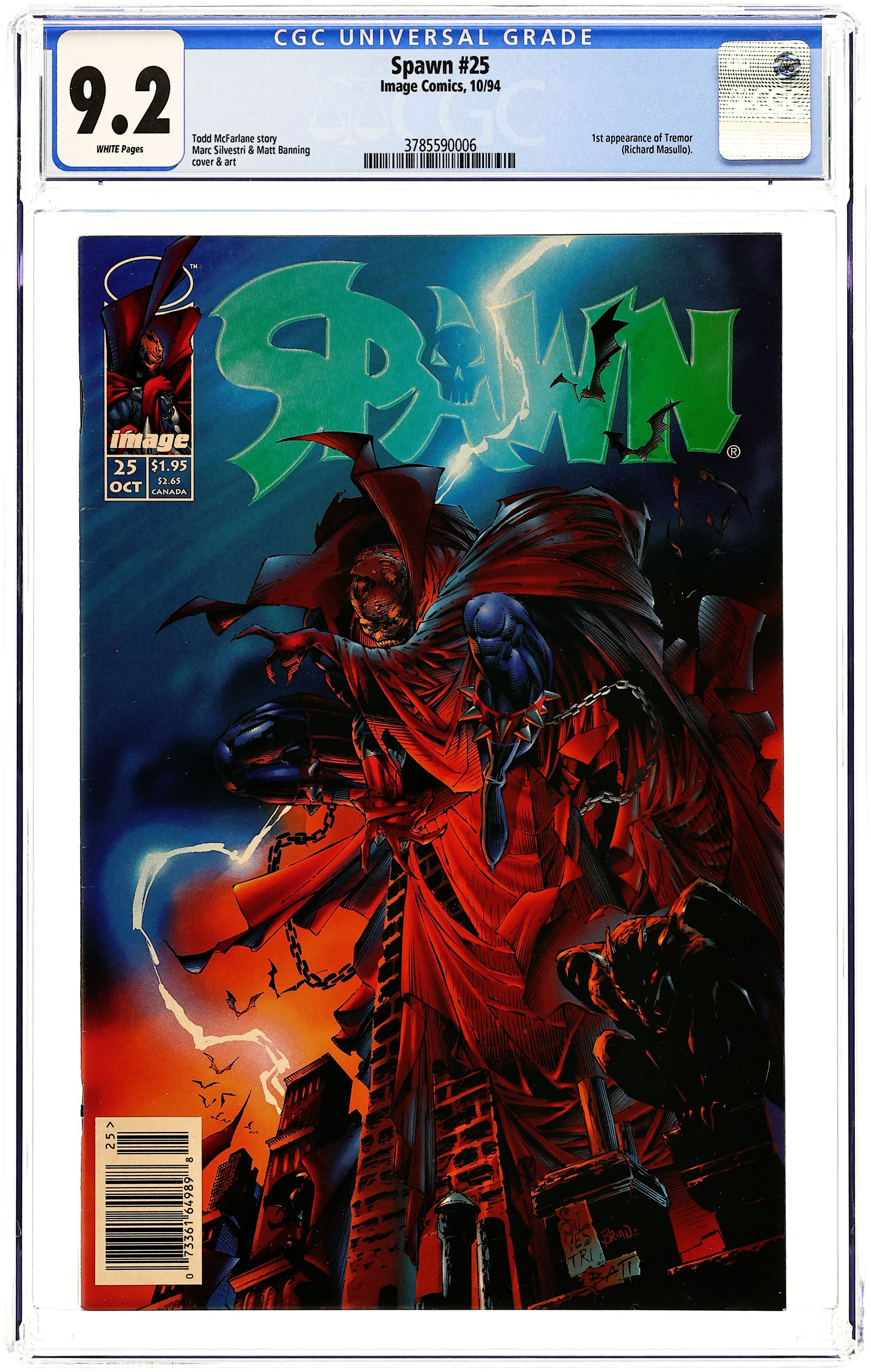 Newsstand edition. A Special Image Event. "Tremors!" 1st appearance Tremor. Story by Todd McFarlane. Art by Marc Silvestri, Batt, and Billy Tan. Spawn discovers he has a new tragic foe by the of Tremor. Part monster, part machine, all killer. NOTE: This month in Image history founding members, Todd McFarlane, Marc Silvestri, Erik Larsen, and Jim Lee swapped books and did an issue of someone else's title. Jim Lee did Savage Dragon (1993 2nd Series) #13, McFarlane did Cyberforce (1993-1997 2nd Series) #8, Larsen did WildC.A.T.s: Covert Action Teams (1992-1998) #14, and Silvestri did this issue of Spawn. - Odinson, Lone Star Comics Archivist Cover price $1.95. Grade: CGC 9.2 explanation of grade Condition: Used (collectible)