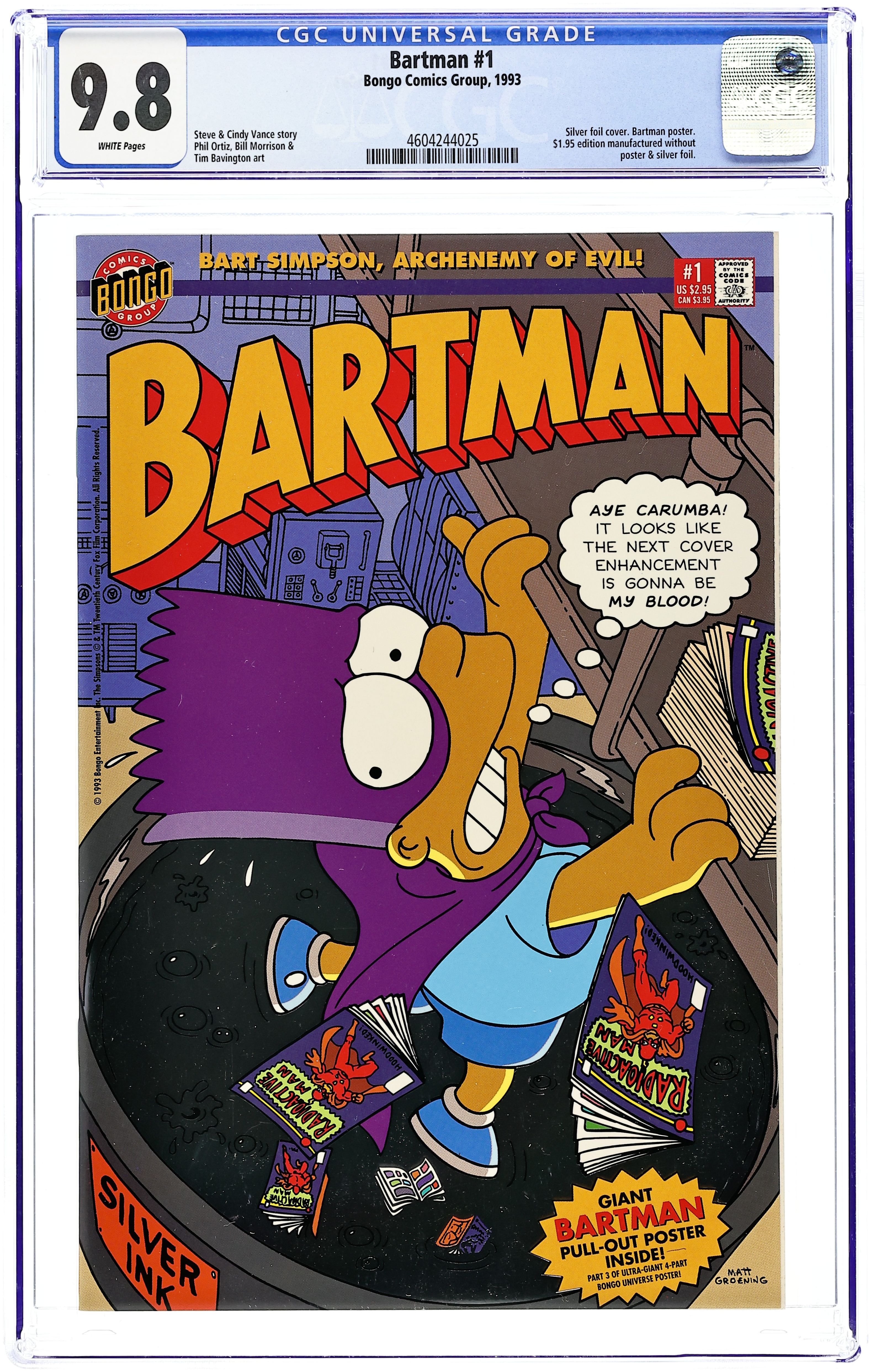 Starts Apr 4 This is the direct edition with Silver Foil Cover and Bartman poster insert. Cover pencils by Steve Vance, inks by Bill Morrison. Matt Groening discusses the Bart Philosophy. The Comic Cover Caper!, script by Cindy Vance (co-plot) and Steve Vance, pencils by Steve Vance (layouts) and Phil Ortiz, inks by Bill Morrison and Tim Bavington (additional inks); Bartman puts a stop to a comic book collector scam. Bart's 40 least favorite items. 36 pgs. $2.95. Cover price $2.95. Grade: CGC 9.8 explanation of grade Condition: Used (collectible)