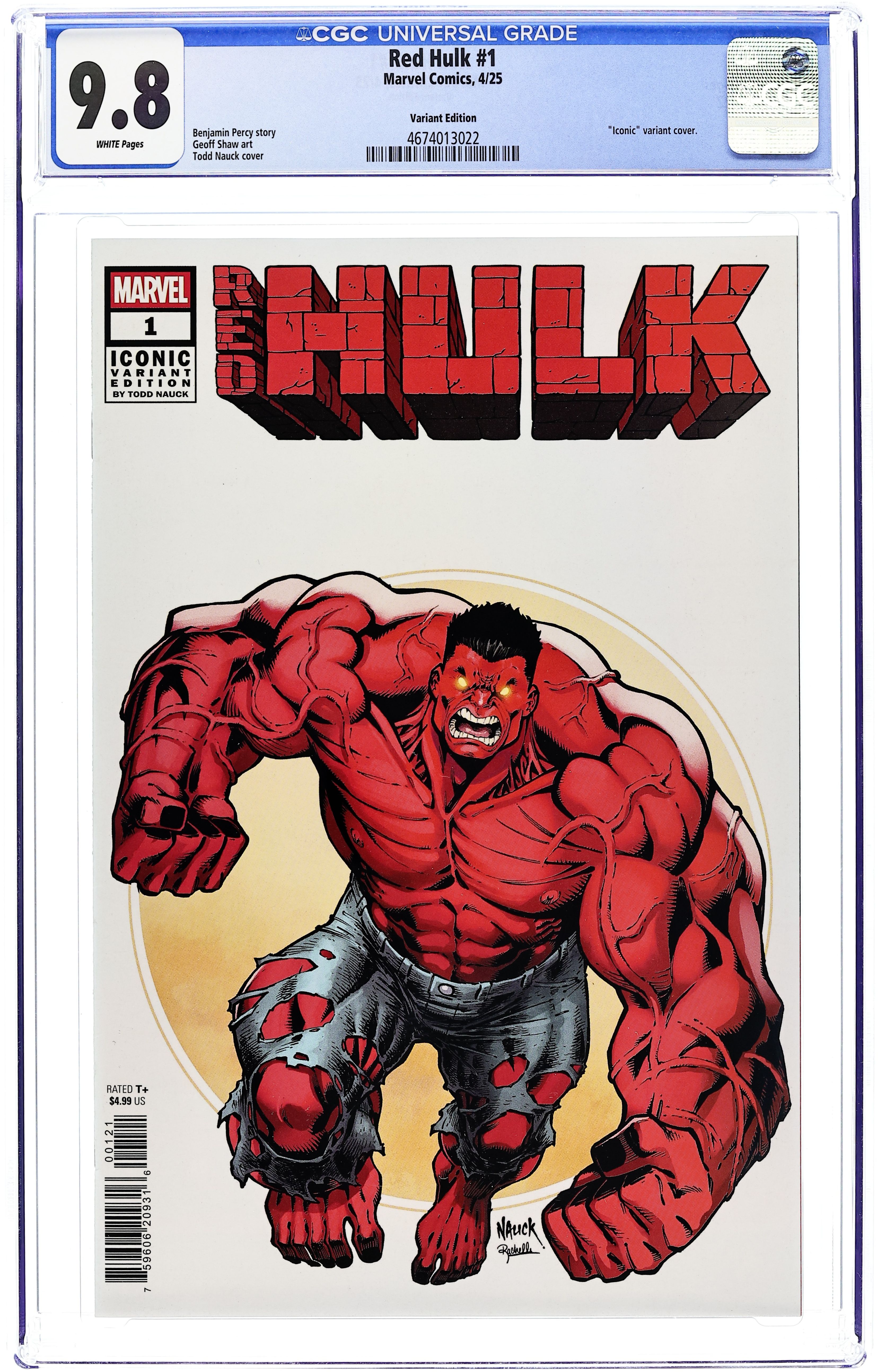 Starts Feb 16 Written by Benjamin Percy. Art by Geoff Shaw. Cover by Todd Nauck. RED HULK RAGES INTO ONE WORLD UNDER DOOM! •THUNDERBOLT ROSS - in a cell deep below the ground - is a prisoner of DOCTOR DOOM And he is not alone. Brilliant military, criminal and political minds have been gathered against their will in a prison complex that serves as a "THINK TANK" to help carry out Doom's plan for global domination. But the RED HULK has other plans! Guest starring MACHINE MAN and DEATHLOK! 32 pages, full color. Rated T+ Cover price $4.99. Grade: CGC 9.8 explanation of grade Condition: Used (collectible) unless item is a new release