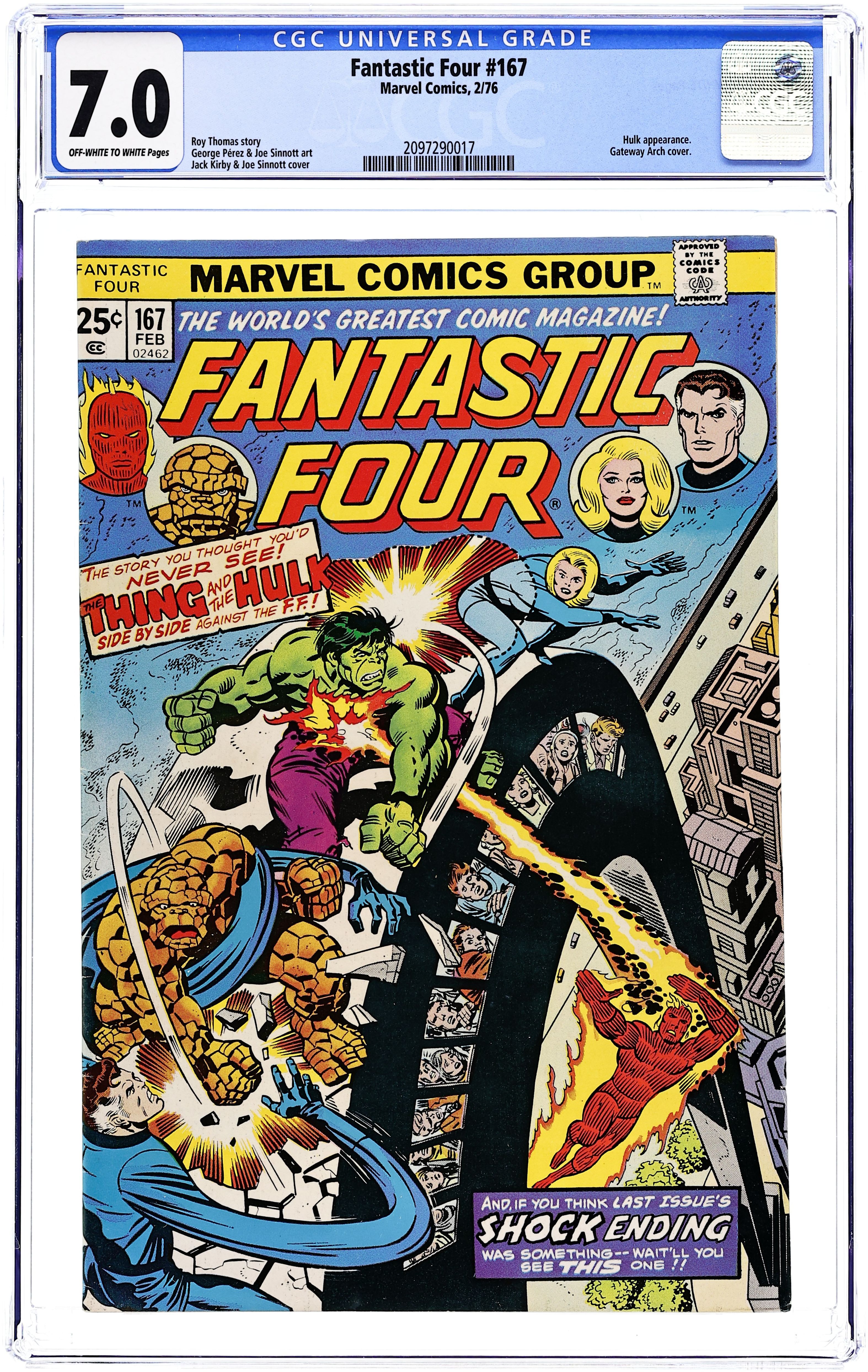Starts Feb 9 "Titans Two!" Part 2 of 2. Guest-starring the Hulk. Script by Roy Thomas. Art by George Perez (breakdowns) and Joe Sinnott (finishes). Cover by Jack Kirby and Joe Sinnott. In a shocking development, the Thing frees the Hulk! And the powerful pair escapes in a hovercraft towards St. Louis! Mr. Fantastic, the Invisible Girl, and the Human Torch follow in hot pursuit; and on top of the famous Gateway Arch, Ben Grimm will face a critical decision, when the Hulk threatens Reed's life! (Notes: The Hulk's adventure in the Midwest continues in Incredible Hulk 195. In response to a fan letter, Roy Thomas clarifies the terms: artist, penciler, embellisher, and inker. The letters page contains Marvel Value Stamp series B #38 Conan the Barbarian by Barry Windsor-Smith.) 36 pages Cover price $0.25. Grade: CGC 7.0 explanation of grade Condition: Used (collectible)
