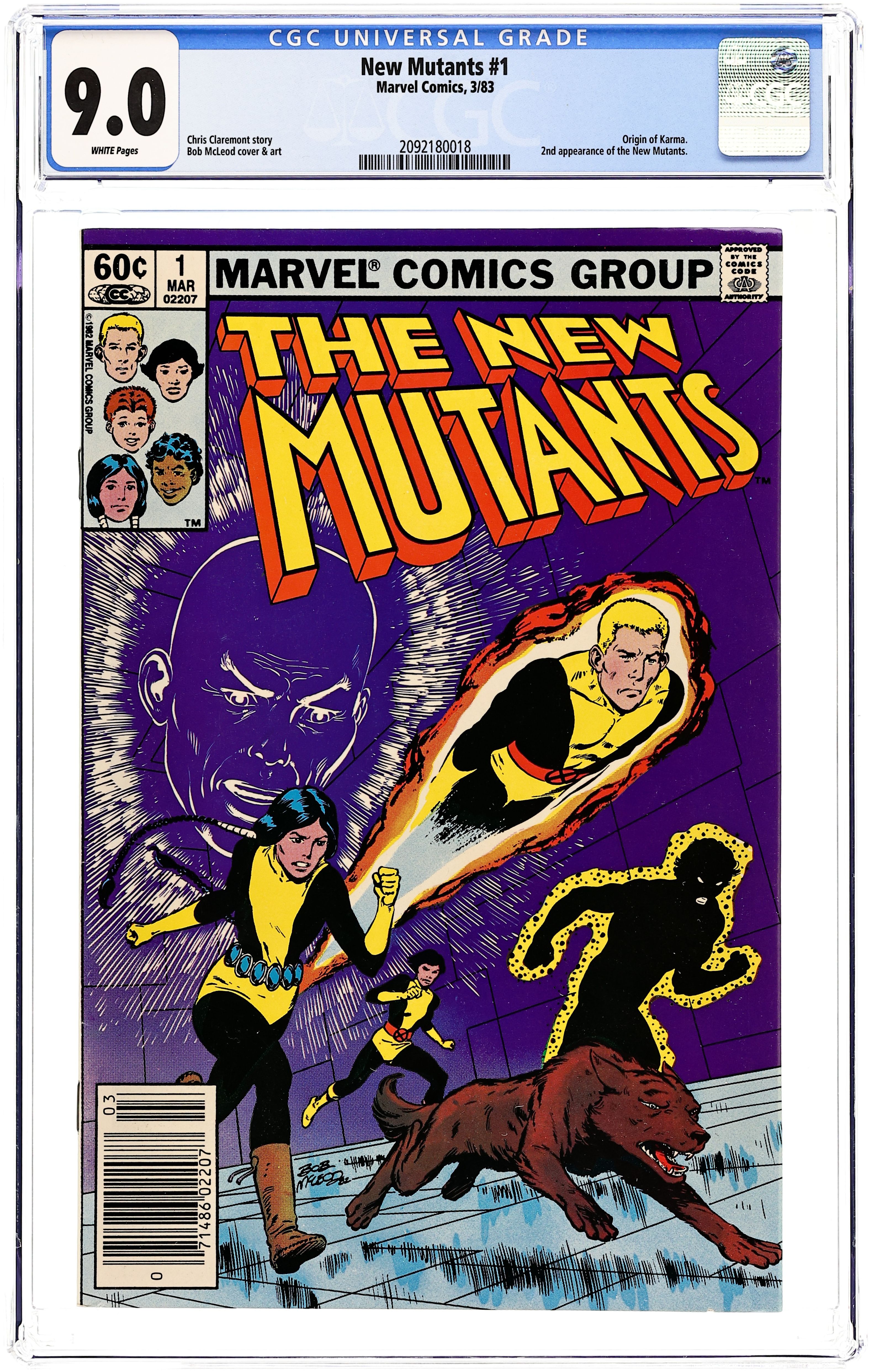 Starts Feb 2 Newsstand Edition. Regular series begins (first appearance is in Marvel Graphic Novel 4). Cover art by Bob McLeod. Initiation!, script by Chris Claremont, pencils by Bob McLeod, inks by Mike Gustovich; The New Mutants get acclimated to their new home, new talents, new friends, and new teachers, unaware that they are being watched; Moira learns that Professor X has a son; and Psyche is attacked in the Danger Room by an unknown assailant; Origin of Karma. Second appearance of the New Mutants (after Marvel Graphic Novel #4). Cover price $0.60. Grade: CGC 9.0 explanation of grade Condition: Used (collectible)