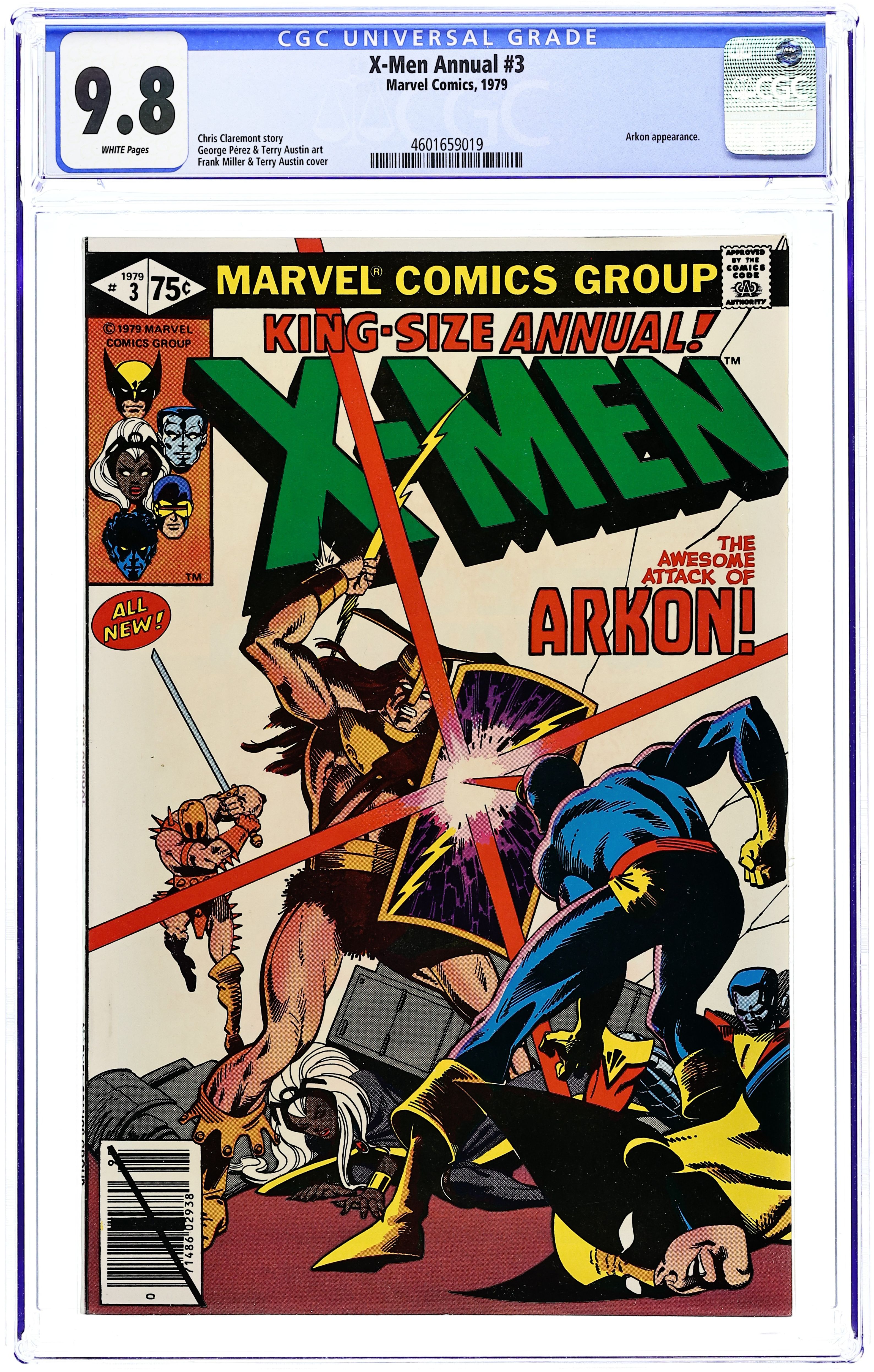 Direct Edition. A Fire in the Sky! - Written by Chris Claremont. Art by George Pérez and Terry Austin. Cover by Frank Miller and Terry Austin. The X-Men battle Arkon and are transported to his world where they are asked to help save it. Story takes place between Uncanny X-Men (1963 1st Series) #124 and 125. Characters in this issue: X-Men [Cyclops; Storm; Wolverine; Colossus; Nightcrawler; Banshee]; Edwin Jarvis; VILLAINS: Arkon; Imperions; CAMEO FLASHBACK: Captain America [Steve Rogers]; Thor; Iron Man [Tony Stark]. 52 pages, full color. Cover price $0.75. Grade: CGC 9.8 explanation of grade Condition: Used (collectible)
