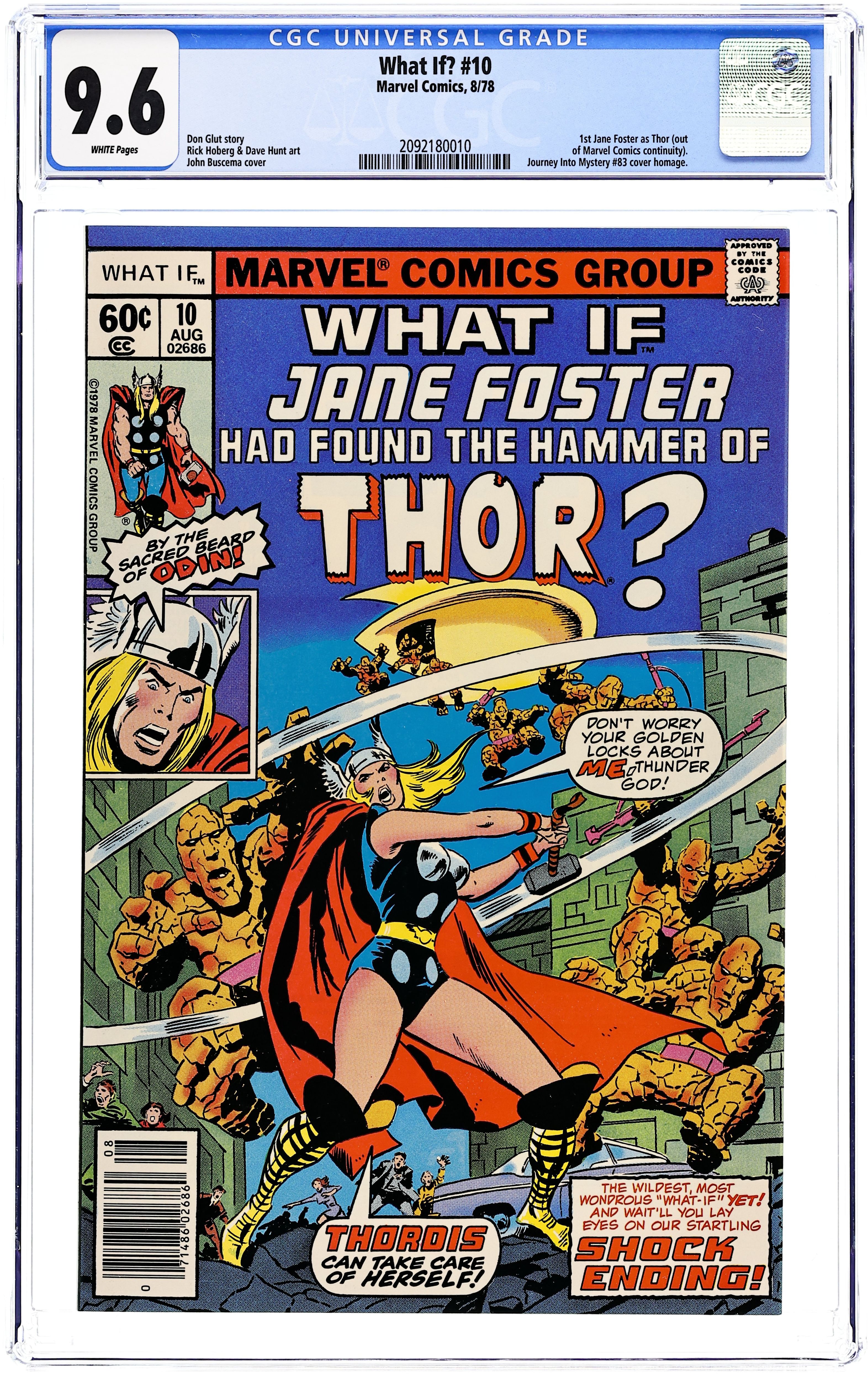 Starts Feb 2 Cover art by John Buscema. What if Jane Foster had Found -- the Hammer of Thor?, script by Don Glut, pencils by Rick Hoberg, inks by Dave Hunt; Jane Foster finds the Hammer instead of Don Blake and becomes "Thordis." Hostess Fruit Pie ad with Spider-Man, pencils by Sal Buscema, inks by Joe Sinnott. 52 pgs. Cover price $0.60. Grade: CGC 9.6 explanation of grade Condition: Used (collectible)